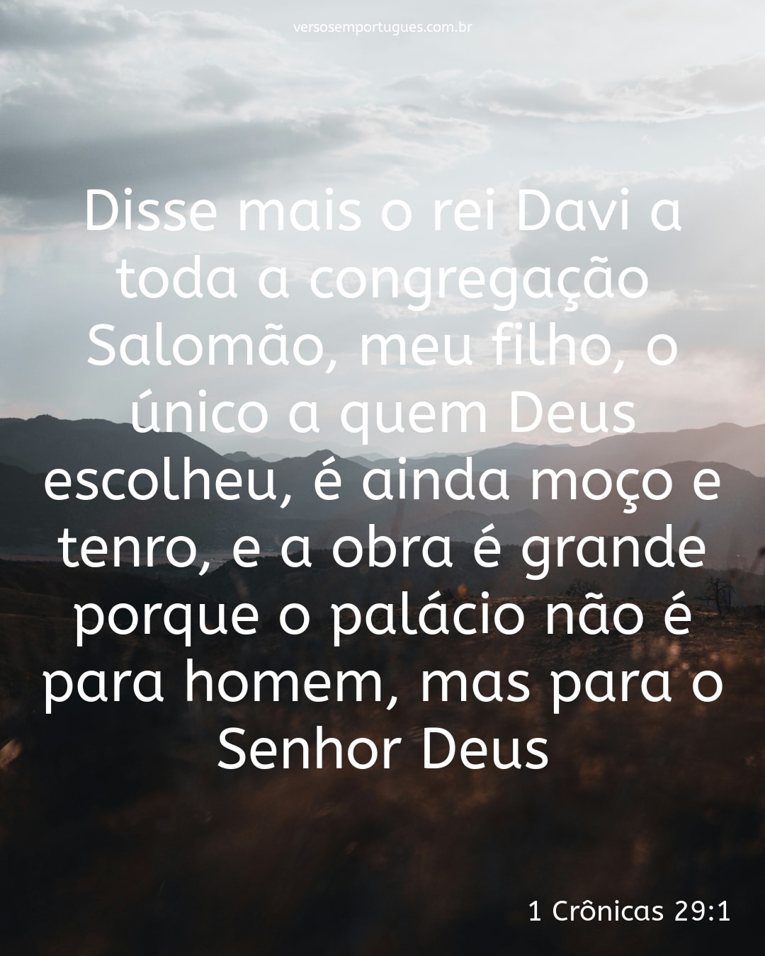 Disse, pois, Davi a seu filho Salomão: Esforça-te e tem bom ânimo, e faze a obra; não temas, nem te desalentes, pois o Senhor Deus, meu Deus, é contigo; não te deixará, nem te desamparará, até que seja acabada toda a obra para o serviço da casa do Senhor.