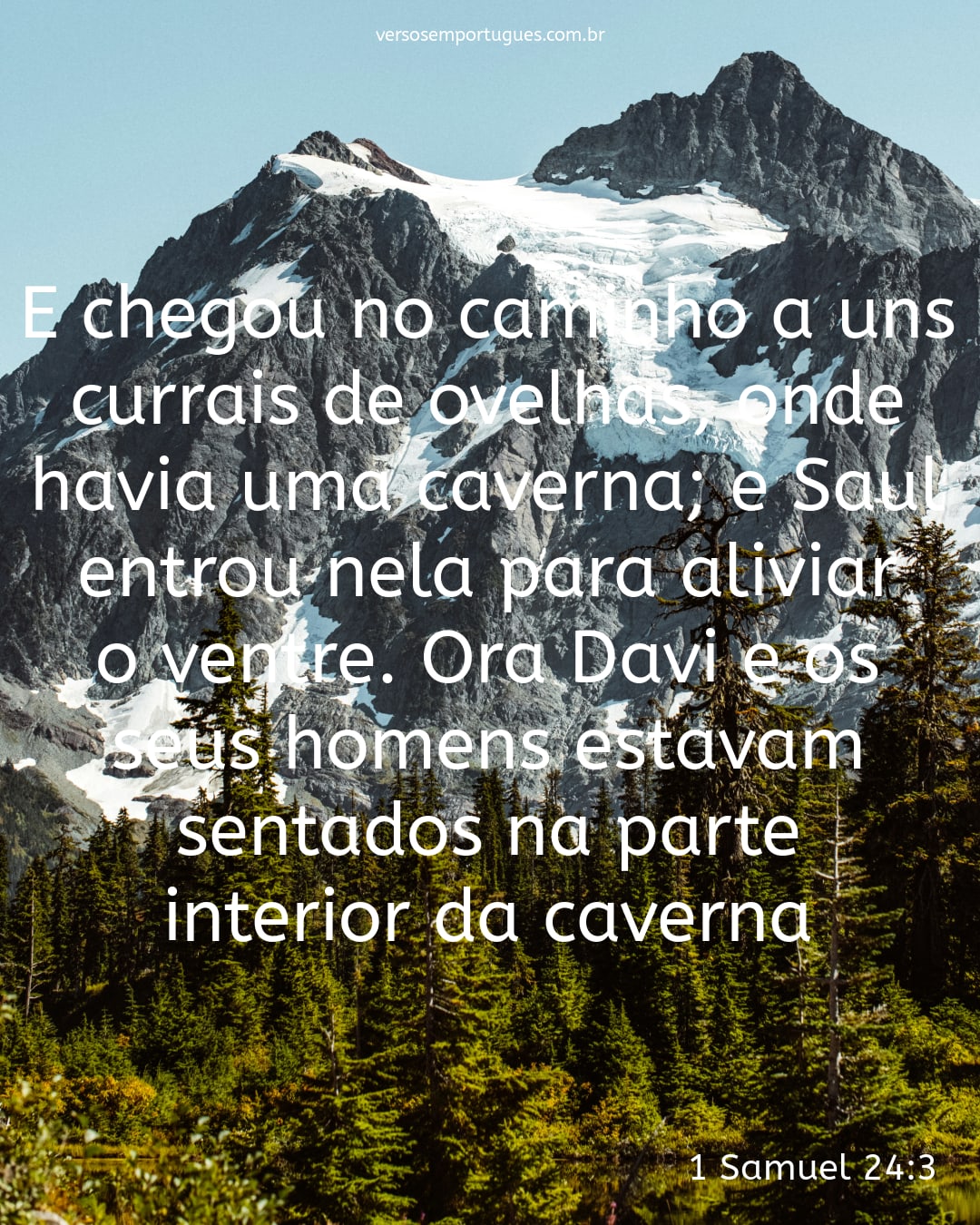 E chegou no caminho a uns currais de ovelhas, onde havia uma caverna; e Saul entrou nela para aliviar o ventre. Ora Davi e os seus homens estavam sentados na parte interior da caverna.