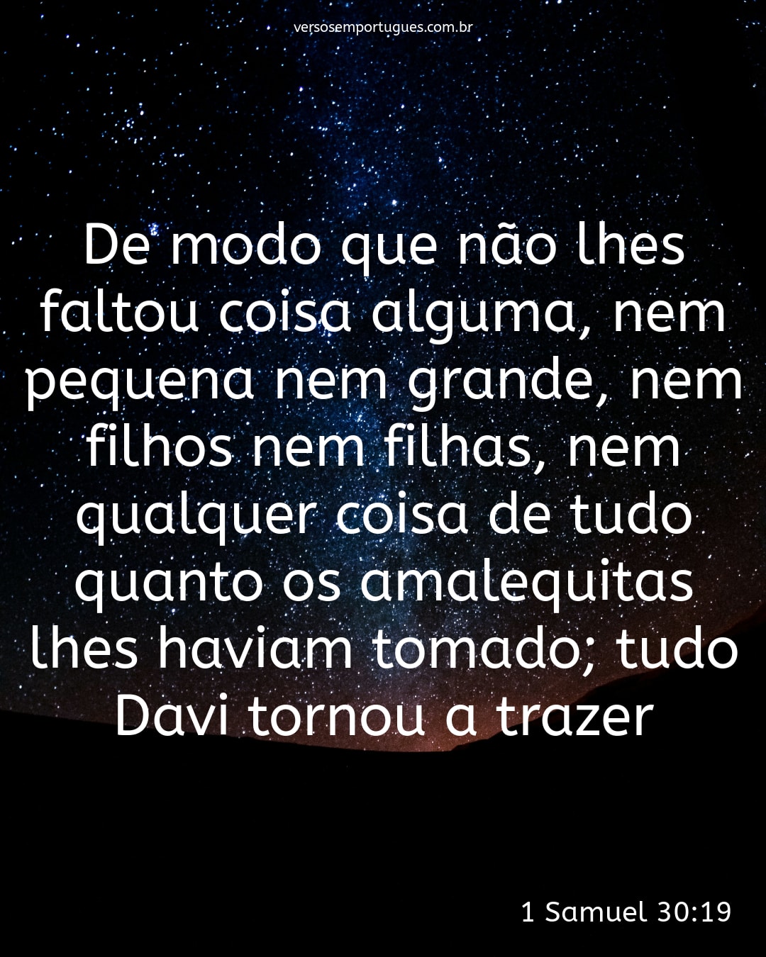 De modo que não lhes faltou coisa alguma, nem pequena nem grande, nem filhos nem filhas, nem qualquer coisa de tudo quanto os amalequitas lhes haviam tomado; tudo Davi tornou a trazer.