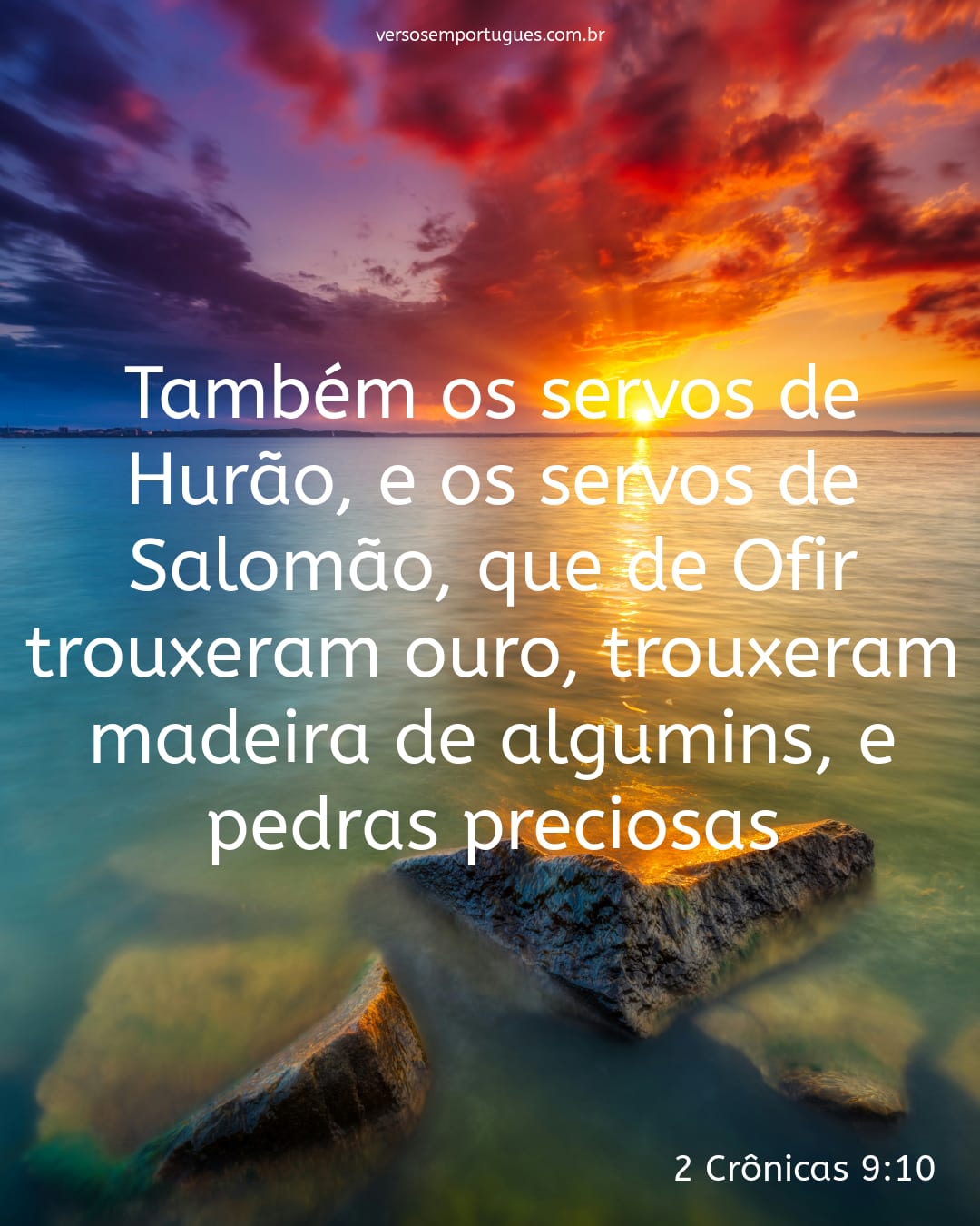 Tendo a rainha de Sabá ouvido da fama de Salomão, veio a Jerusalém para prová-lo por enigmas; trazia consigo uma grande comitiva, e camelos carregados de especiarias, e ouro em abundância, e pedras preciosas; e vindo ter com Salomão, falou com ele de tudo o que tinha no seu coração.