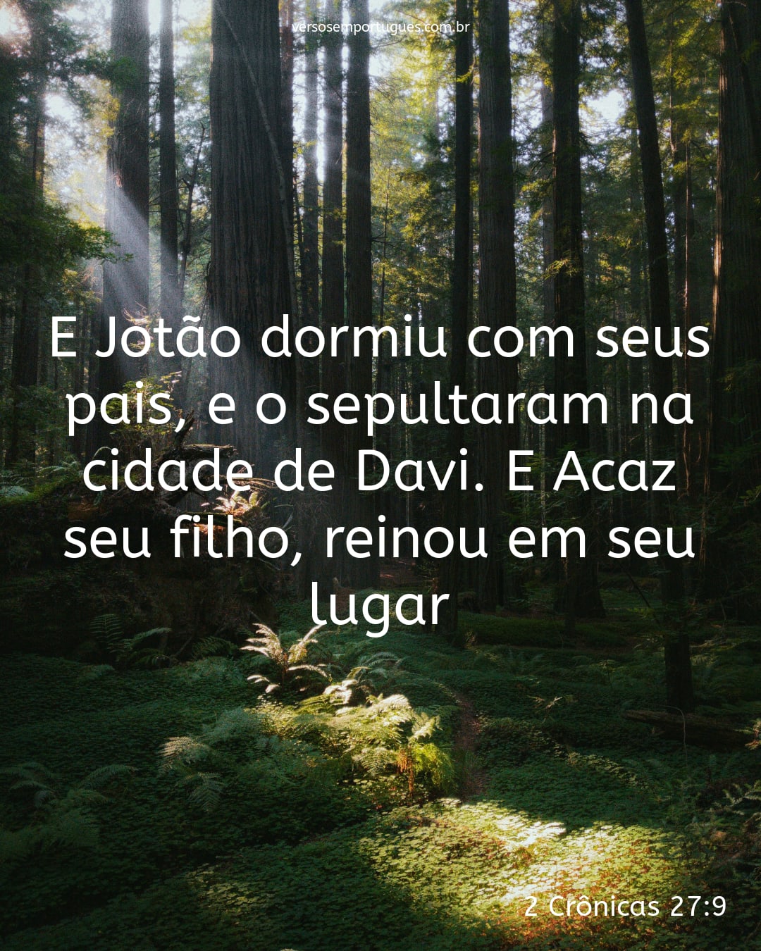 E Jotão dormiu com seus pais, e o sepultaram na cidade de Davi. E Acaz, seu filho, reinou em seu lugar.