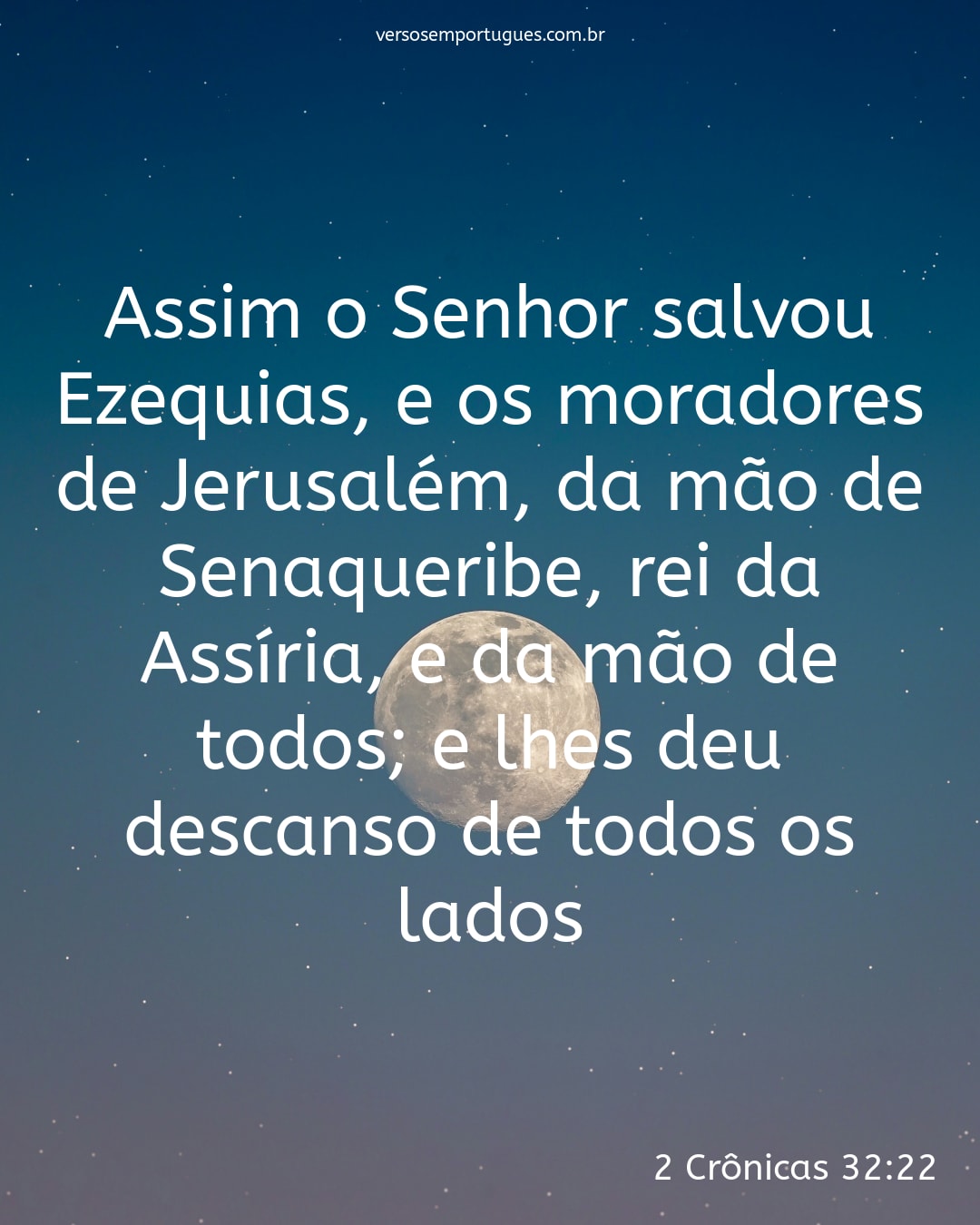 Assim o Senhor salvou Ezequias, e os moradores de Jerusalém, da mão de Senaqueribe, rei da Assíria, e da mão de todos; e lhes deu descanso de todos os lados.