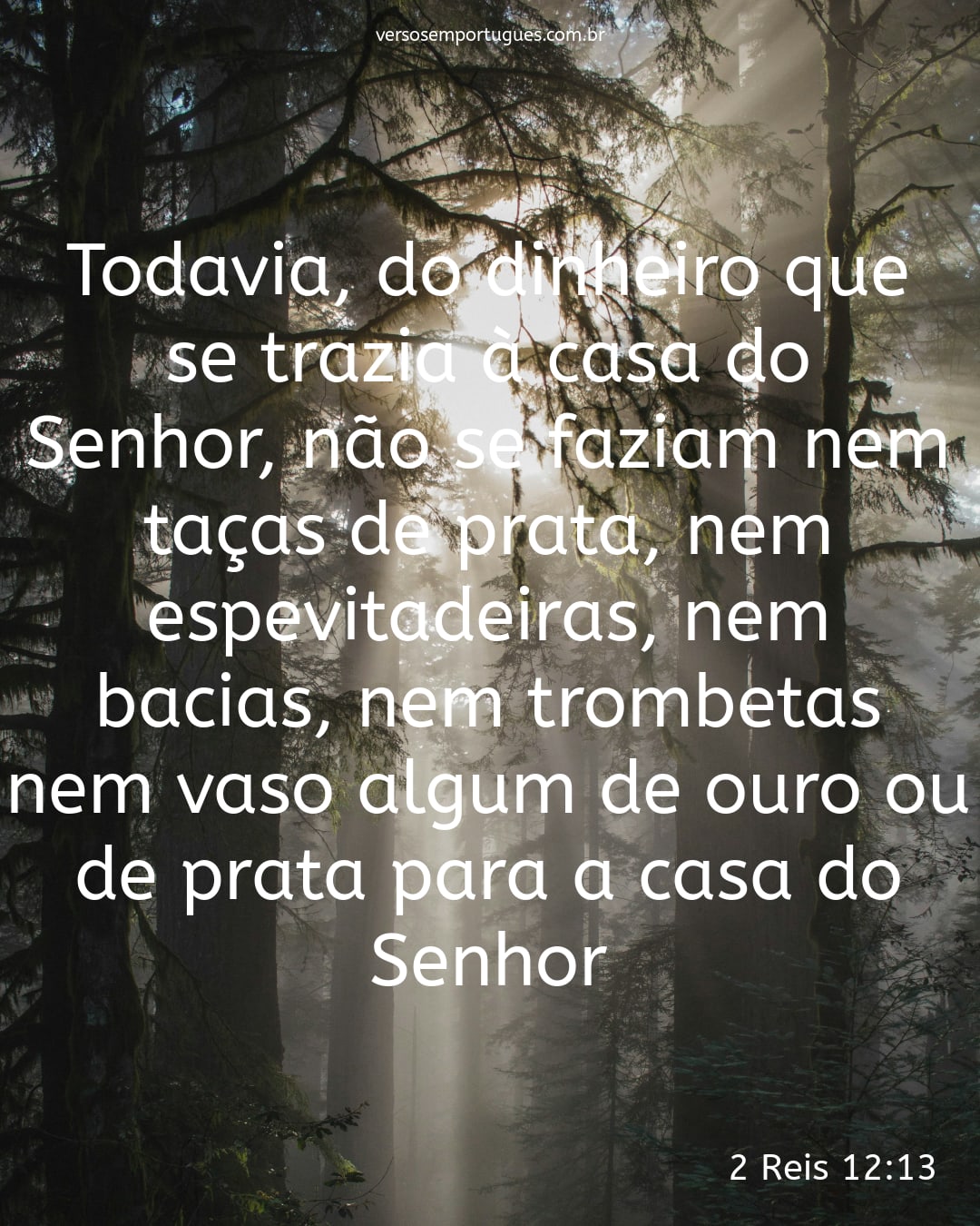 Disse Joás aos sacerdotes: Todo o dinheiro das coisas consagradas que se trouxer à casa do Senhor, o dinheiro daquele que passa o arrolamento, o dinheiro de cada uma das pessoas, segundo a sua avaliação, e todo o dinheiro que cada um trouxer voluntariamente para a casa do Senhor,