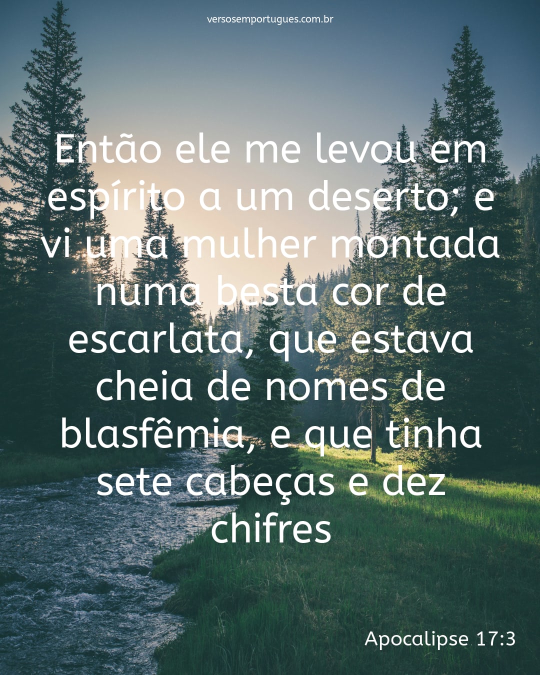 Então ele me levou em espírito a um deserto; e vi uma mulher montada numa besta cor de escarlata, que estava cheia de nomes de blasfêmia, e que tinha sete cabeças e dez chifres.