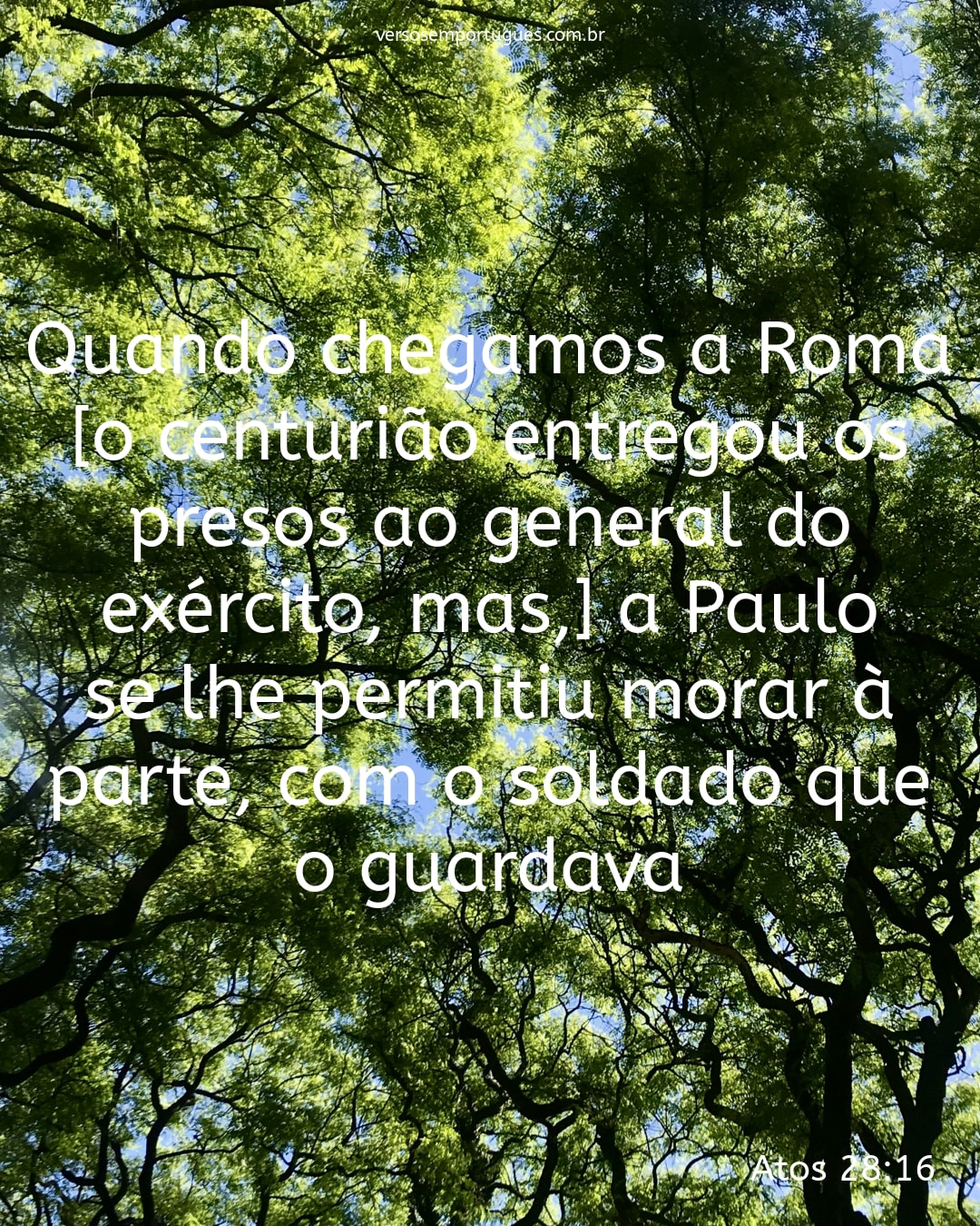 Quando chegamos a Roma, [o centurião entregou os presos ao general do exército, mas,] a Paulo se lhe permitiu morar à parte, com o soldado que o guardava.