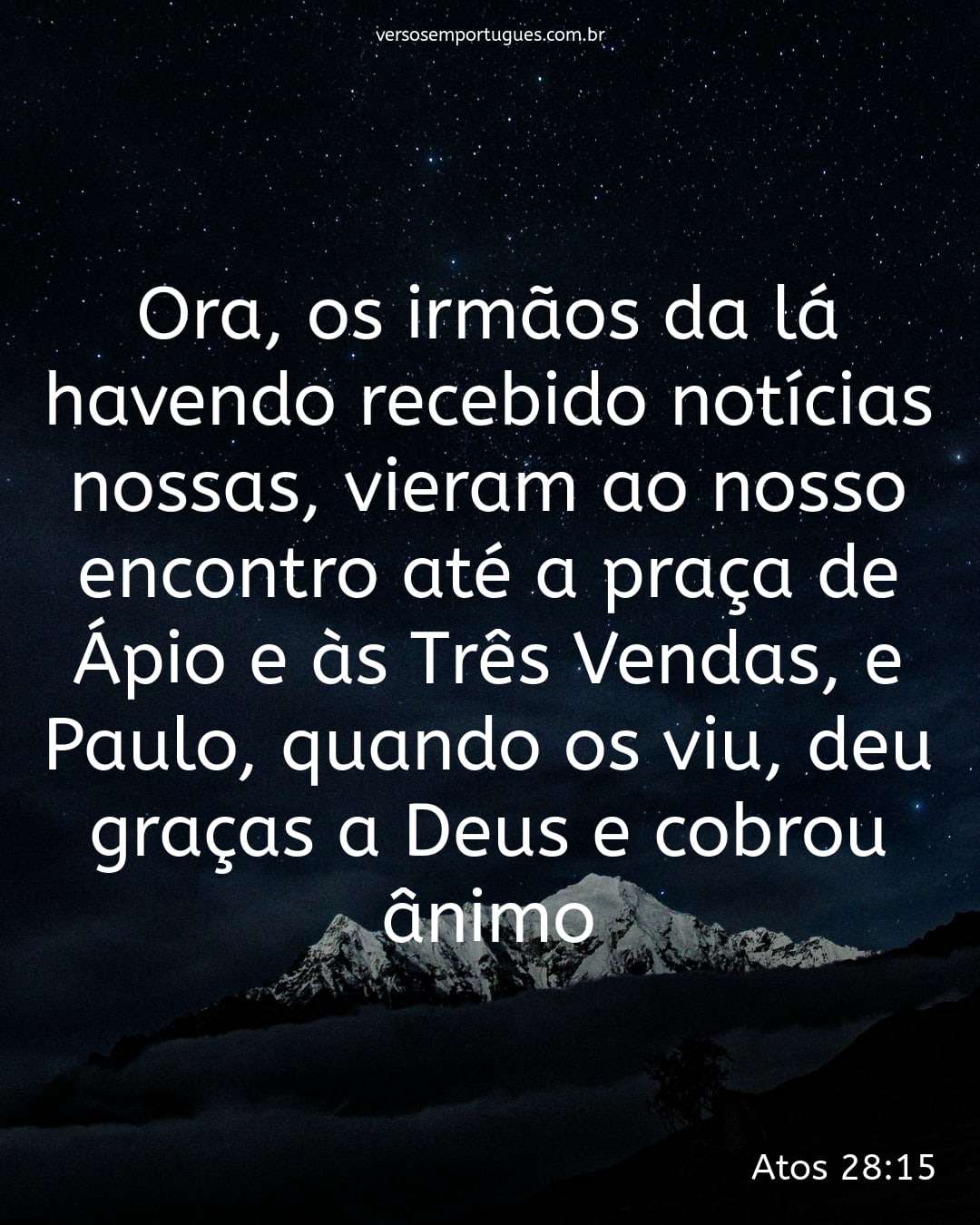 Ora, os irmãos da lá, havendo recebido notícias nossas, vieram ao nosso encontro até a praça de Ápio e às Três Vendas, e Paulo, quando os viu, deu graças a Deus e cobrou ânimo.