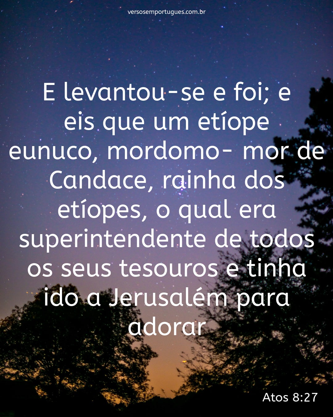 E levantou-se e foi; e eis que um etíope, eunuco, mordomo- mor de Candace, rainha dos etíopes, o qual era superintendente de todos os seus tesouros e tinha ido a Jerusalém para adorar,