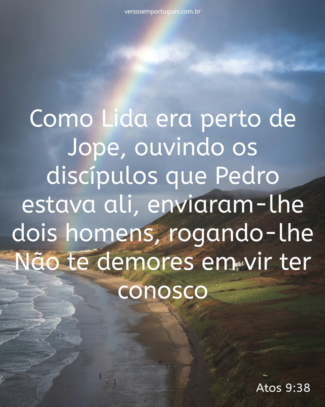 Como Lida era perto de Jope, ouvindo os discípulos que Pedro estava ali, enviaram-lhe dois homens, rogando-lhe: Não te demores em vir ter conosco.