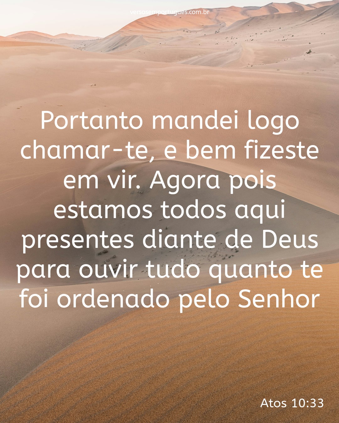 Portanto mandei logo chamar-te, e bem fizeste em vir. Agora pois estamos todos aqui presentes diante de Deus, para ouvir tudo quanto te foi ordenado pelo Senhor.