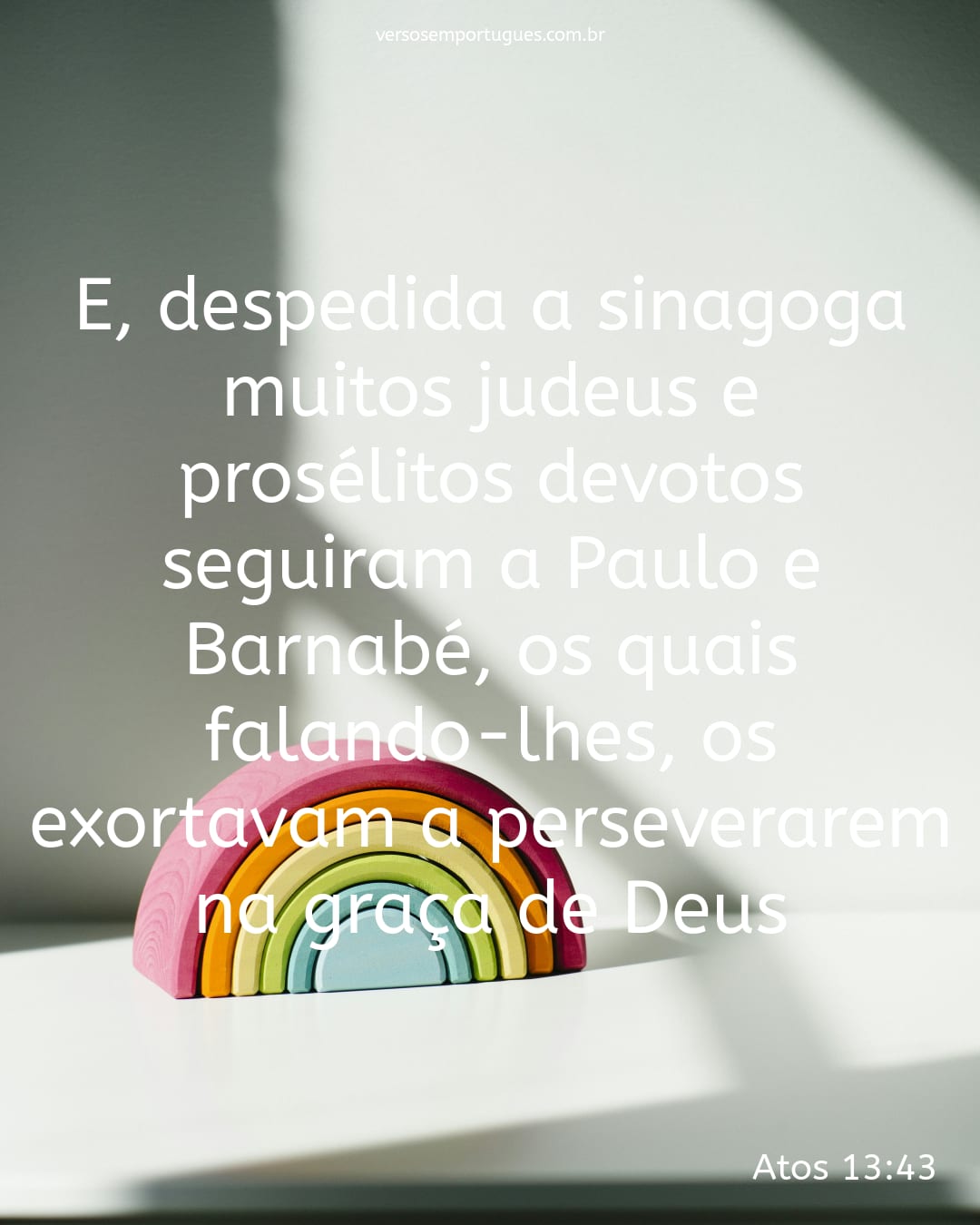 E, despedida a sinagoga, muitos judeus e prosélitos devotos seguiram a Paulo e Barnabé, os quais, falando-lhes, os exortavam a perseverarem na graça de Deus.