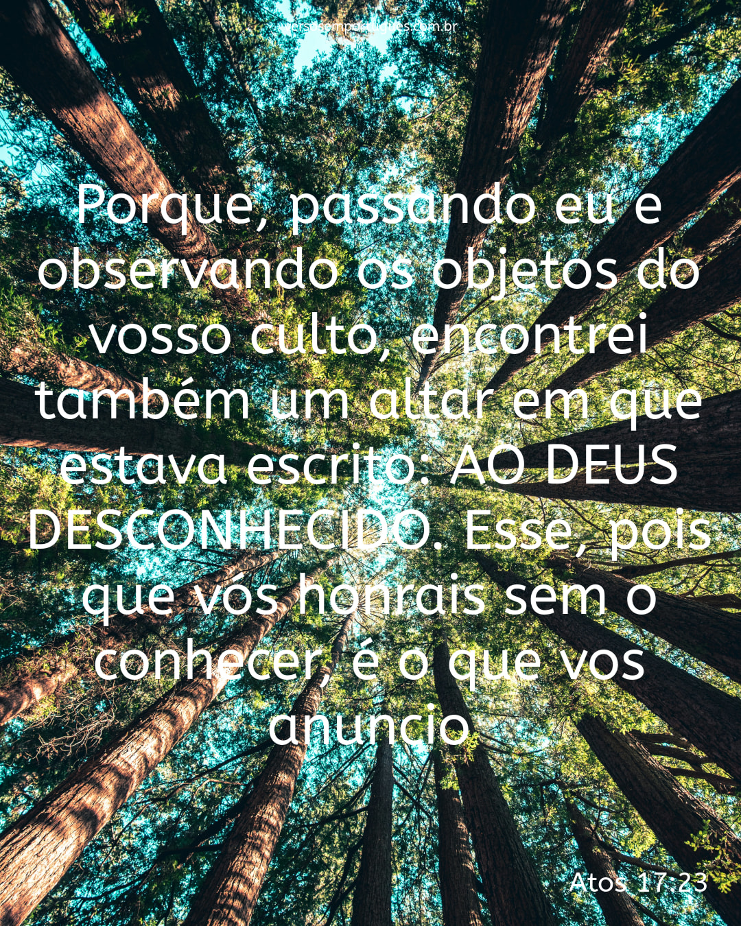 Porque, passando eu e observando os objetos do vosso culto, encontrei também um altar em que estava escrito: AO DEUS DESCONHECIDO. Esse, pois, que vós honrais sem o conhecer, é o que vos anuncio.
