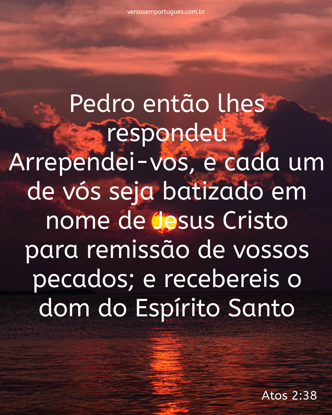 Pedro então lhes respondeu: Arrependei-vos, e cada um de vós seja batizado em nome de Jesus Cristo, para remissão de vossos pecados; e recebereis o dom do Espírito Santo.