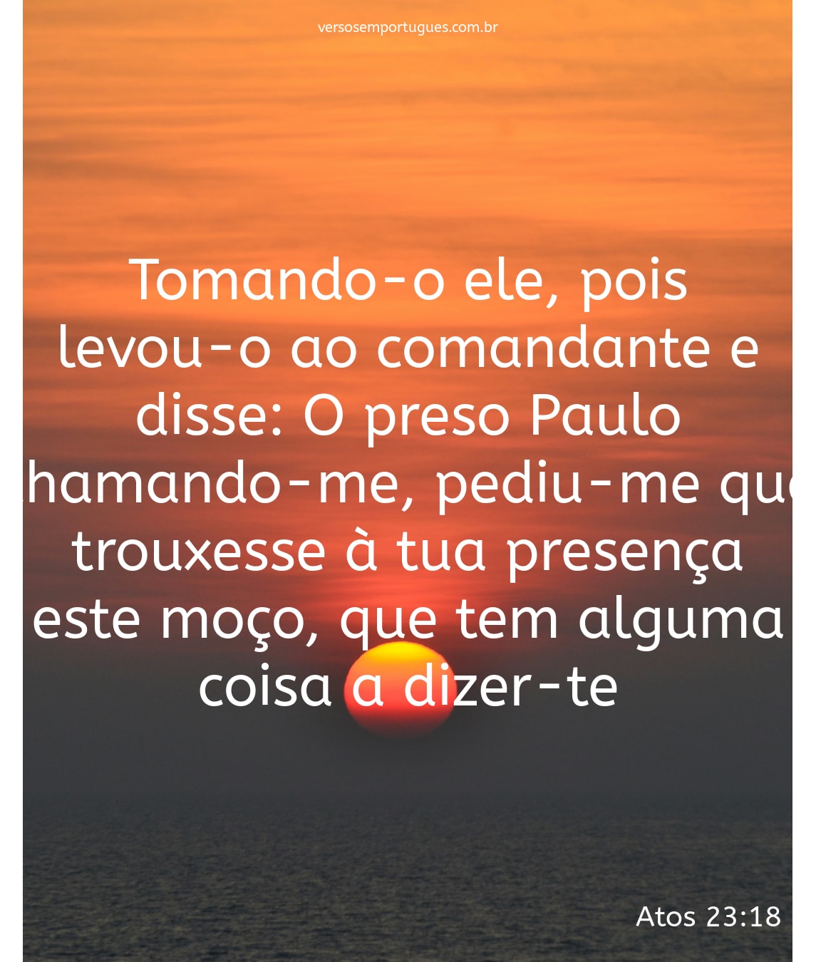 Tomando-o ele, pois, levou-o ao comandante e disse: O preso Paulo, chamando-me, pediu-me que trouxesse à tua presença este moço, que tem alguma coisa a dizer-te.