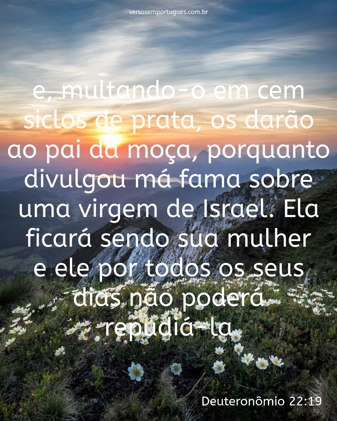 e, multando-o em cem siclos de prata, os darão ao pai da moça, porquanto divulgou má fama sobre uma virgem de Israel. Ela ficará sendo sua mulher, e ele por todos os seus dias não poderá repudiá-la.