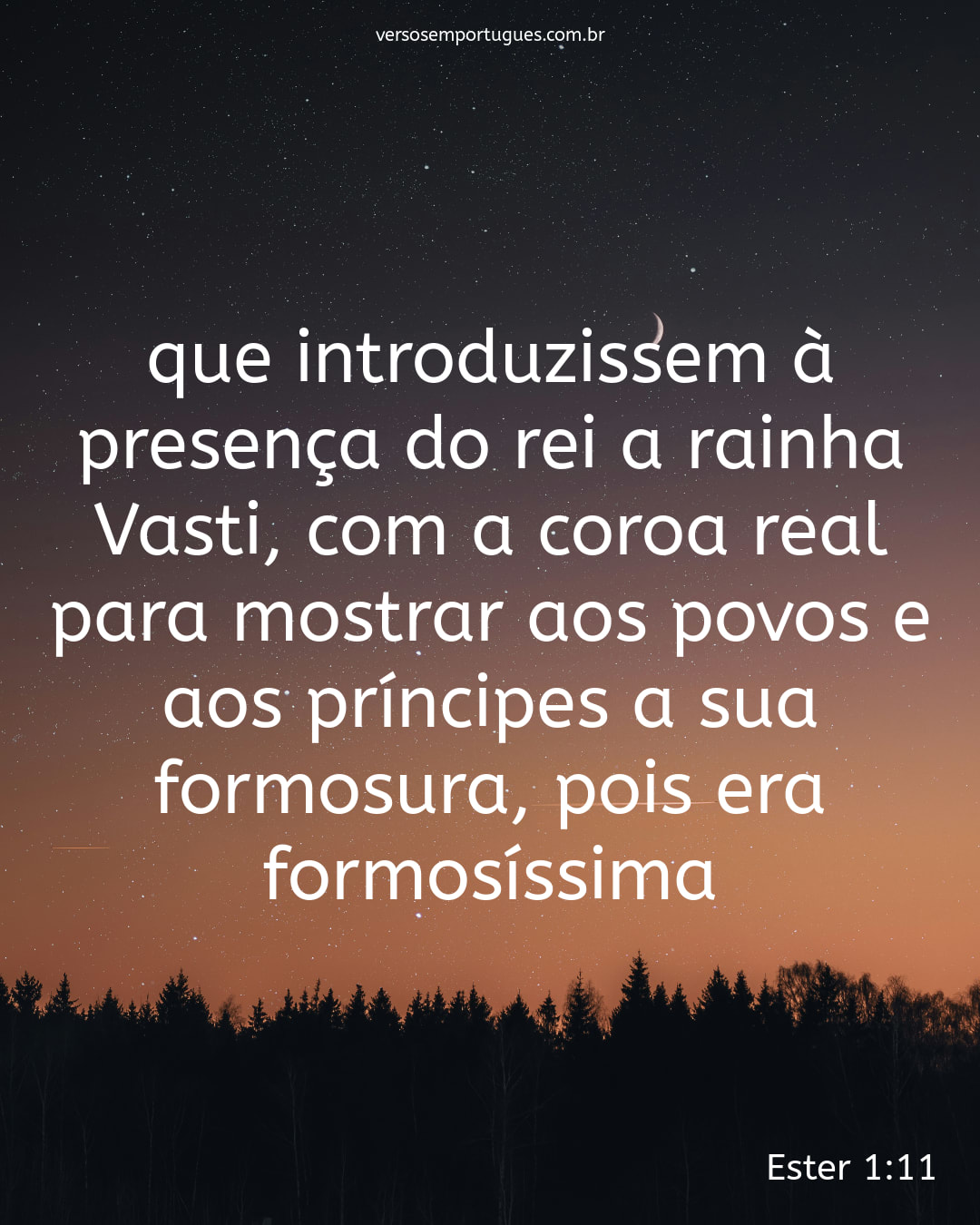 que introduzissem à presença do rei a rainha Vasti, com a coroa real, para mostrar aos povos e aos príncipes a sua formosura, pois era formosíssima.