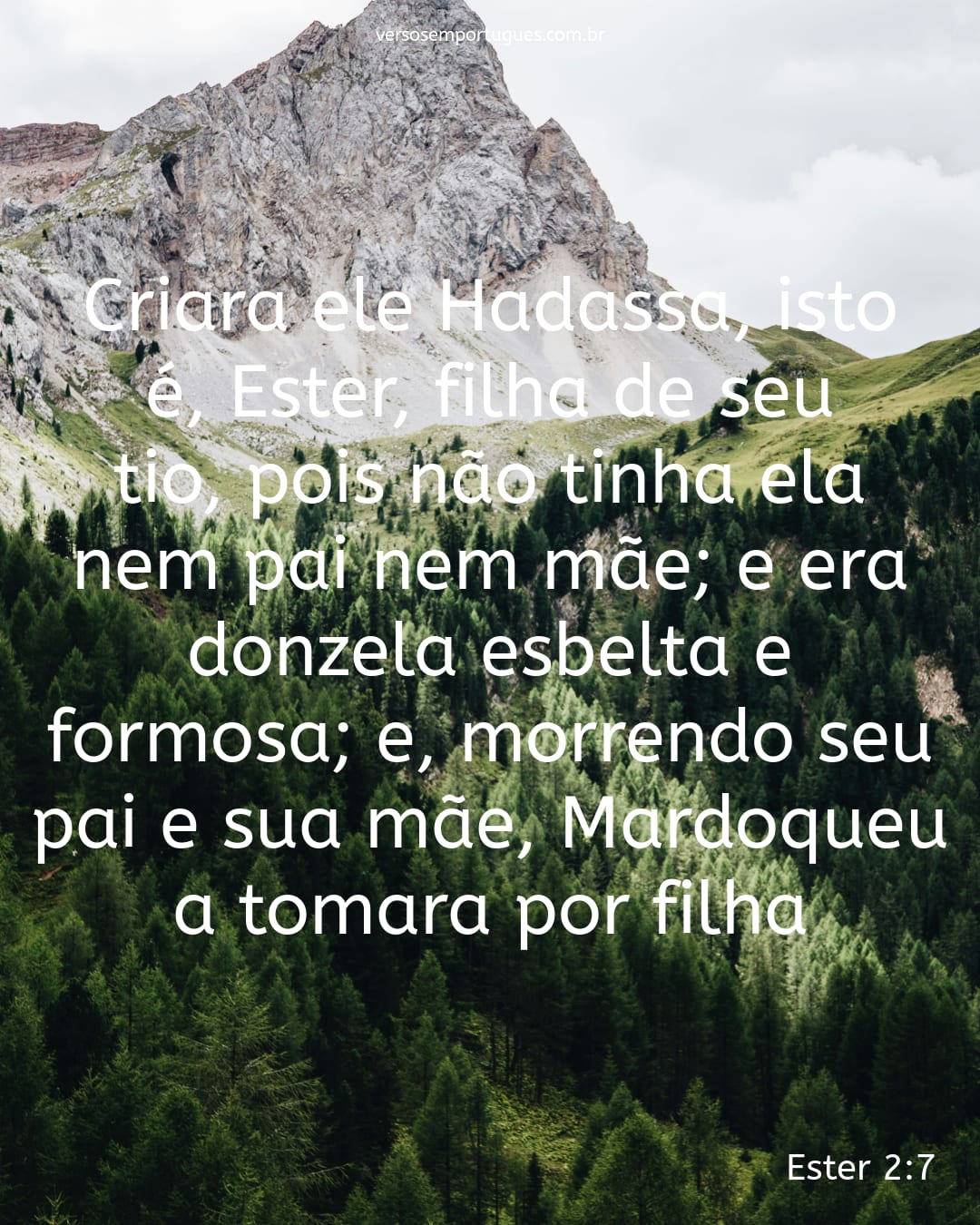 Criara ele Hadassa, isto é, Ester, filha de seu tio, pois não tinha ela nem pai nem mãe; e era donzela esbelta e formosa; e, morrendo seu pai e sua mãe, Mardoqueu a tomara por filha.