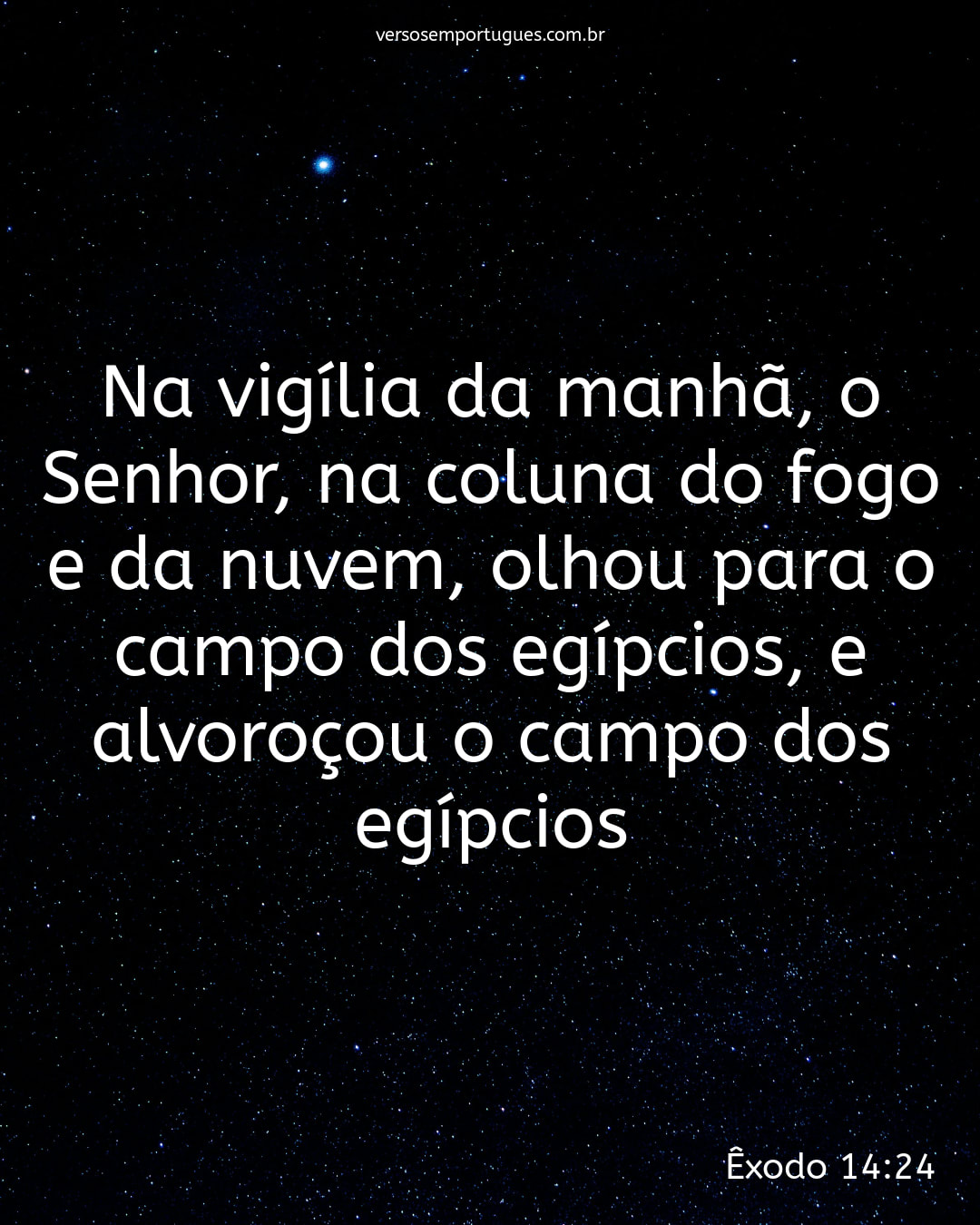 Na vigília da manhã, o Senhor, na coluna do fogo e da nuvem, olhou para o campo dos egípcios, e alvoroçou o campo dos egípcios;