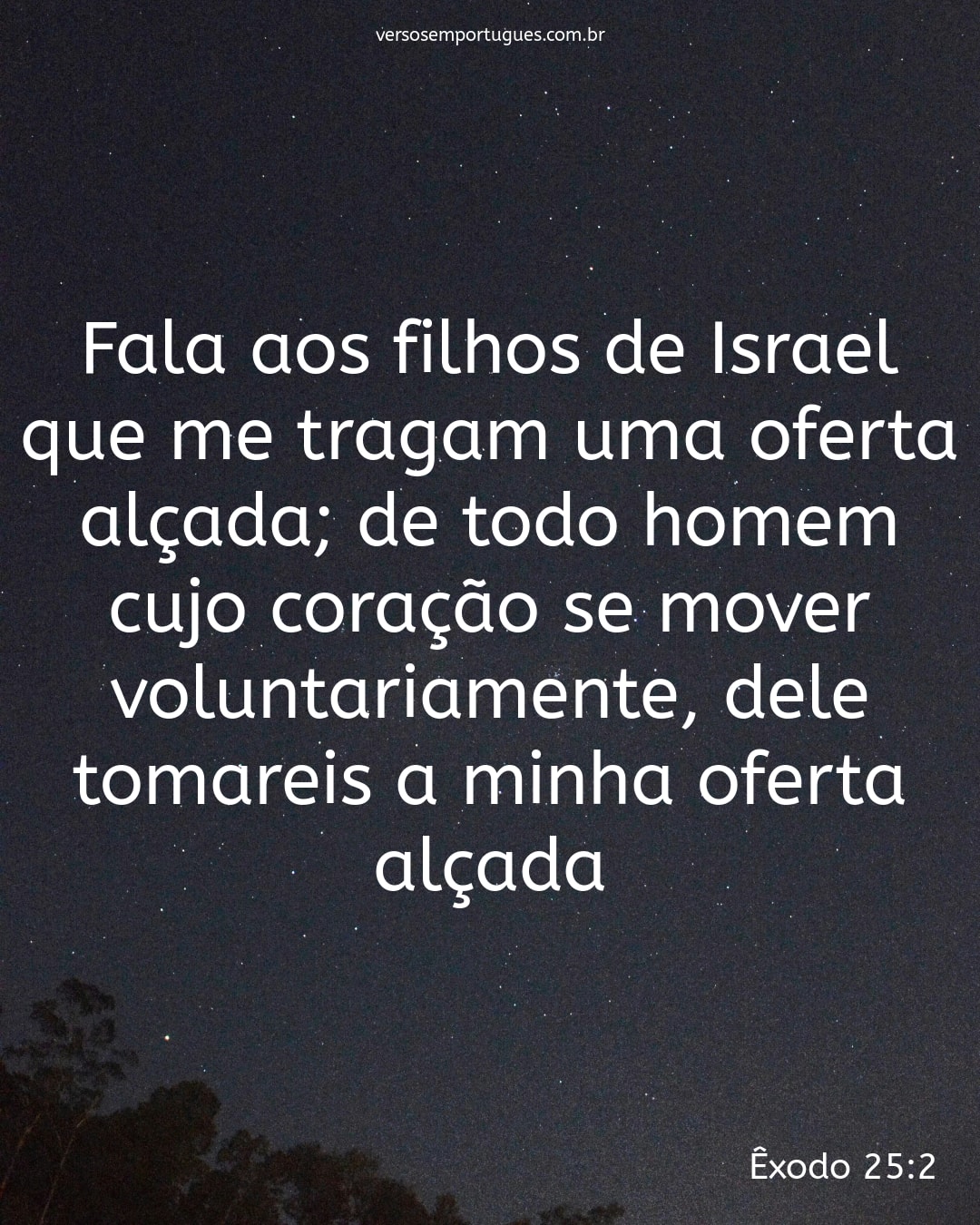 Fala aos filhos de Israel que me tragam uma oferta alçada; de todo homem cujo coração se mover voluntariamente, dele tomareis a minha oferta alçada.