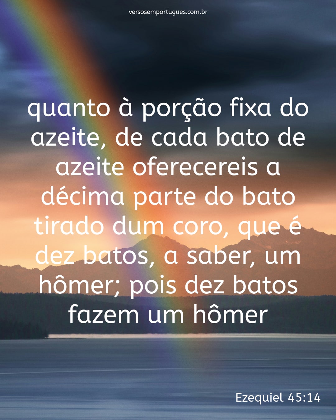 quanto à porção fixa do azeite, de cada bato de azeite oferecereis a décima parte do bato tirado dum coro, que é dez batos, a saber, um hômer; pois dez batos fazem um hômer;