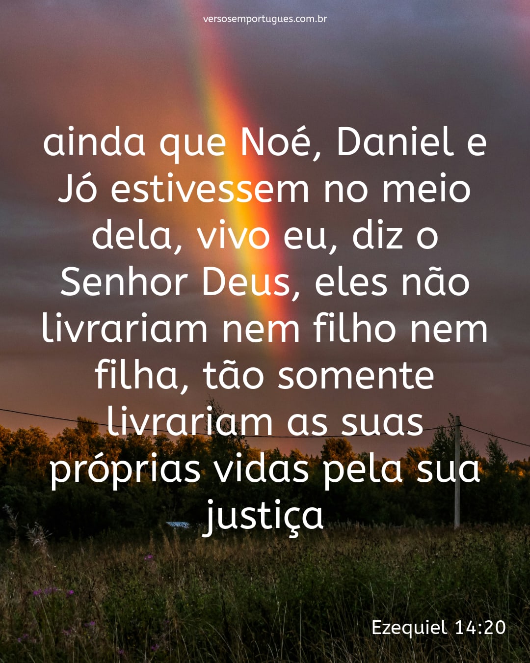 ainda que Noé, Daniel e Jó estivessem no meio dela, vivo eu, diz o Senhor Deus, eles não livrariam nem filho nem filha, tão somente livrariam as suas próprias vidas pela sua justiça.