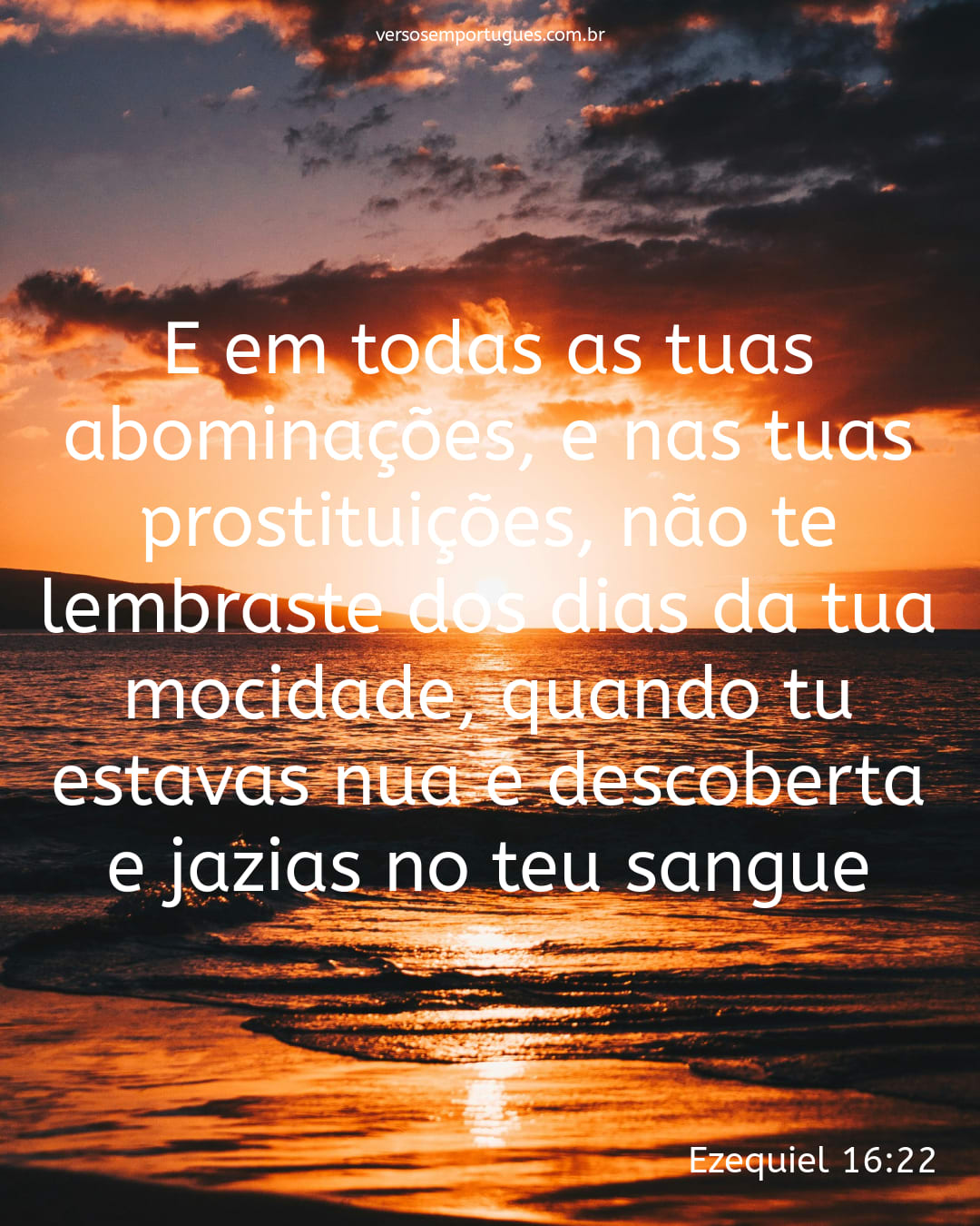 E em todas as tuas abominações, e nas tuas prostituições, não te lembraste dos dias da tua mocidade, quando tu estavas nua e descoberta, e jazias no teu sangue.