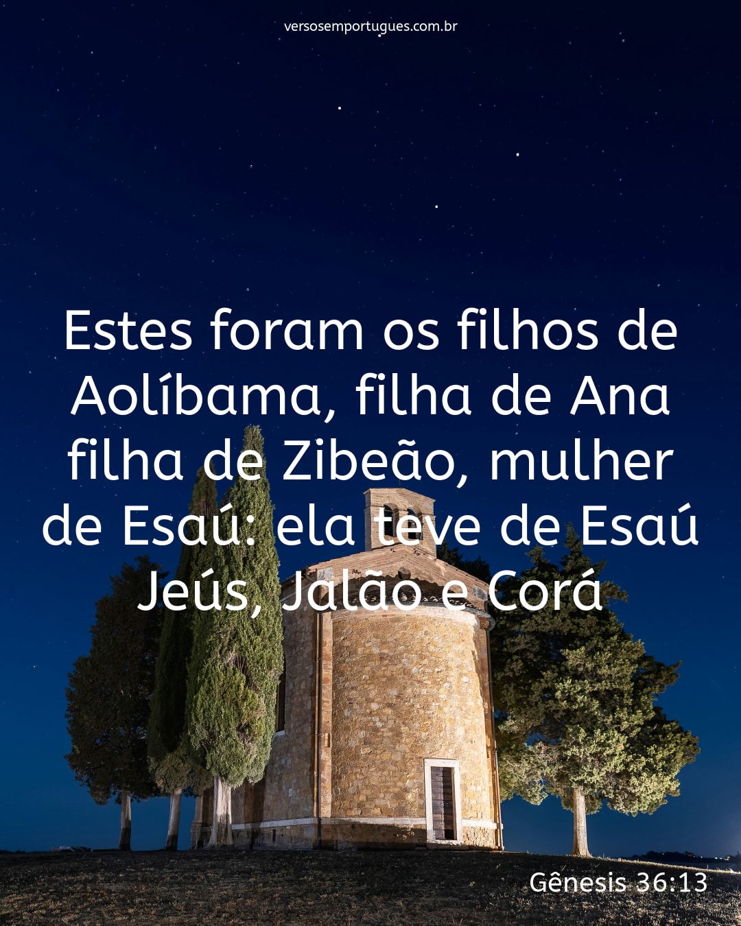 Estes foram os filhos de Aolíbama, filha de Ana, filha de Zibeão, mulher de Esaú: ela teve de Esaú Jeús, Jalão e Corá.