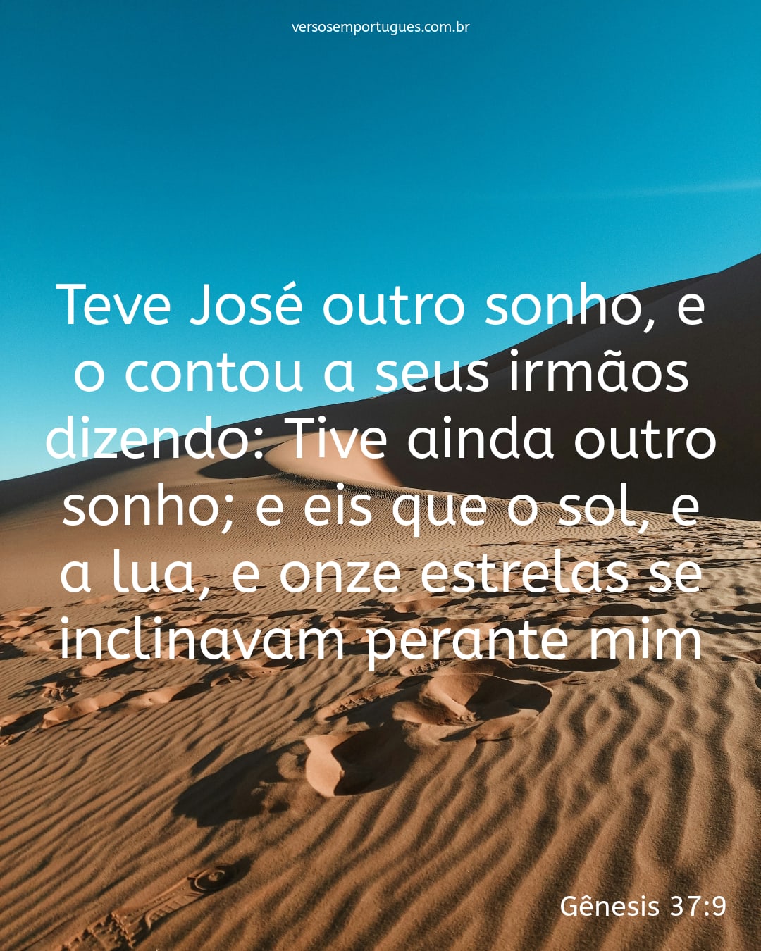 Teve José outro sonho, e o contou a seus irmãos, dizendo: Tive ainda outro sonho; e eis que o sol, e a lua, e onze estrelas se inclinavam perante mim.