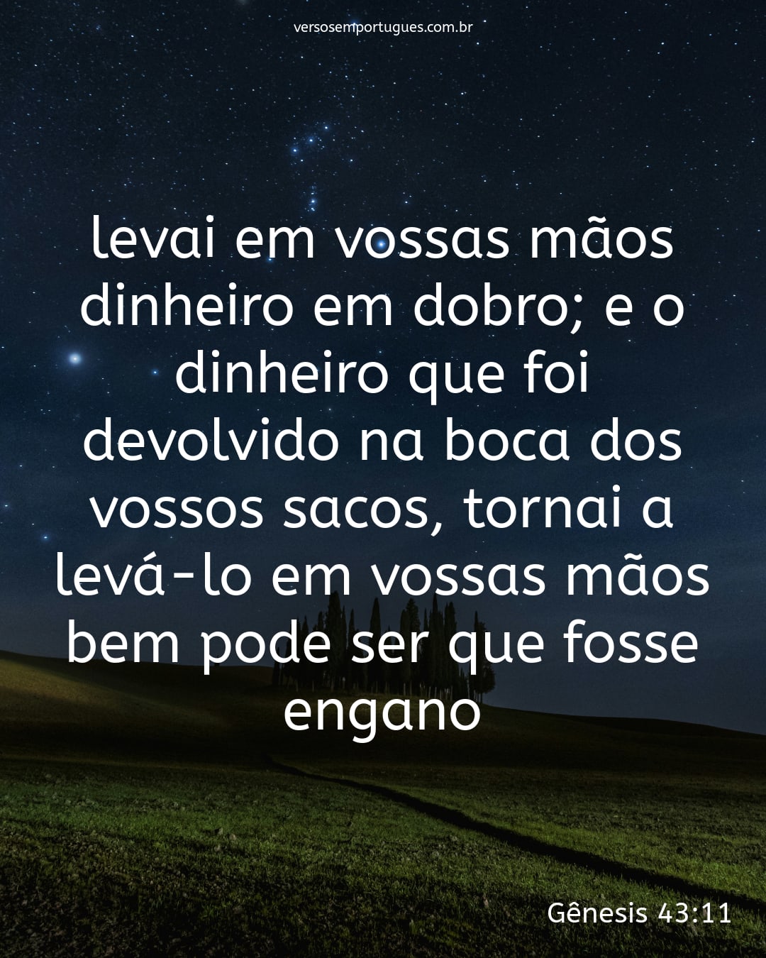 levai em vossas mãos dinheiro em dobro; e o dinheiro que foi devolvido na boca dos vossos sacos, tornai a levá-lo em vossas mãos; bem pode ser que fosse engano.