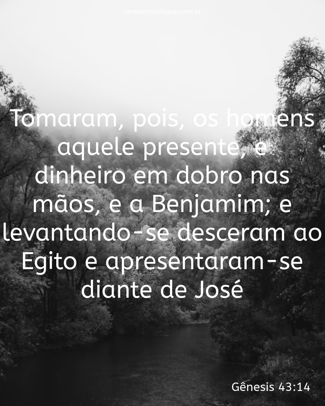 Tomaram, pois, os homens aquele presente, e dinheiro em dobro nas mãos, e a Benjamim; e, levantando-se desceram ao Egito e apresentaram-se diante de José.