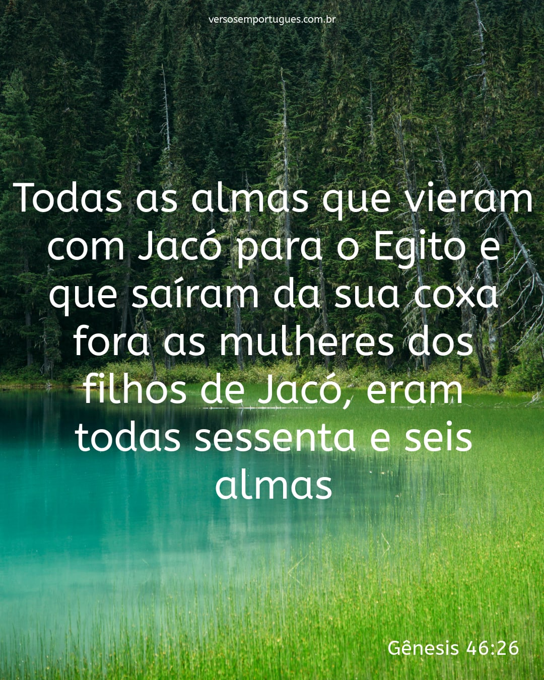 Todas as almas que vieram com Jacó para o Egito e que saíram da sua coxa, fora as mulheres dos filhos de Jacó, eram todas sessenta e seis almas;