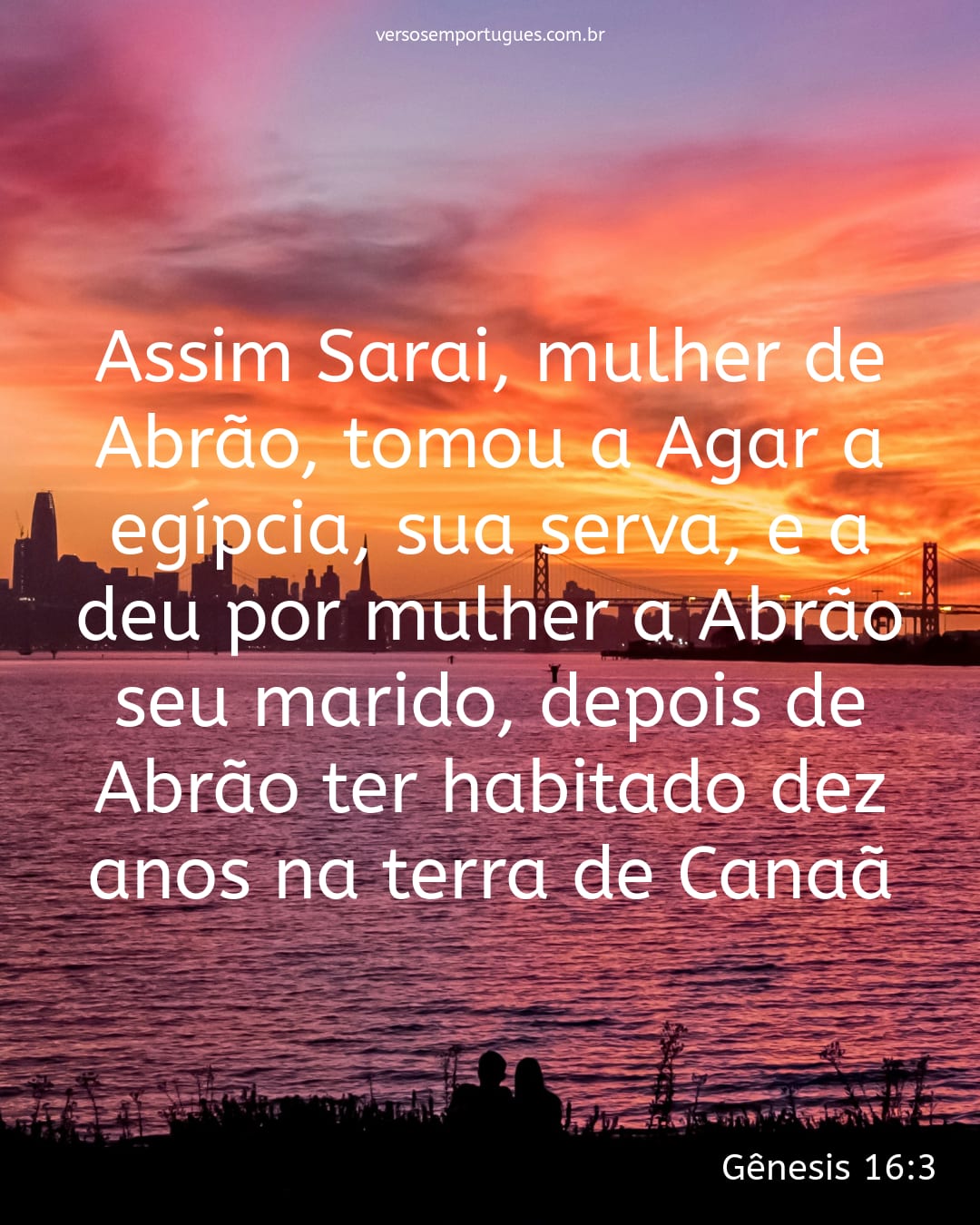 Assim Sarai, mulher de Abrão, tomou a Agar a egípcia, sua serva, e a deu por mulher a Abrão seu marido, depois de Abrão ter habitado dez anos na terra de Canaã.
