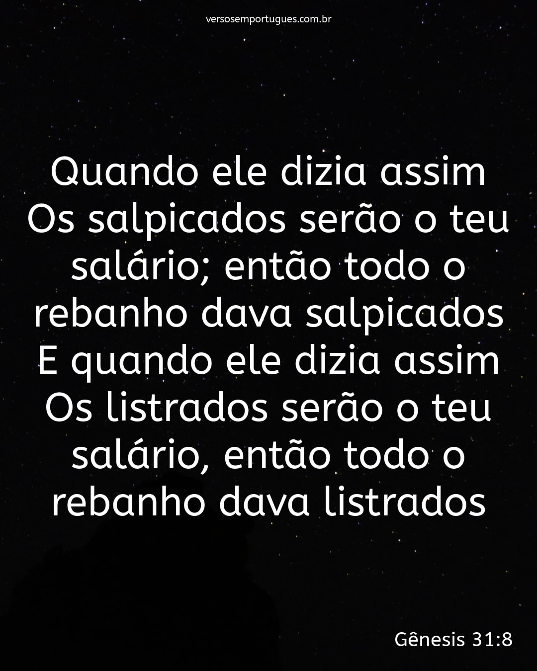 Quando ele dizia assim: Os salpicados serão o teu salário; então todo o rebanho dava salpicados. E quando ele dizia assim: Os listrados serão o teu salário, então todo o rebanho dava listrados.