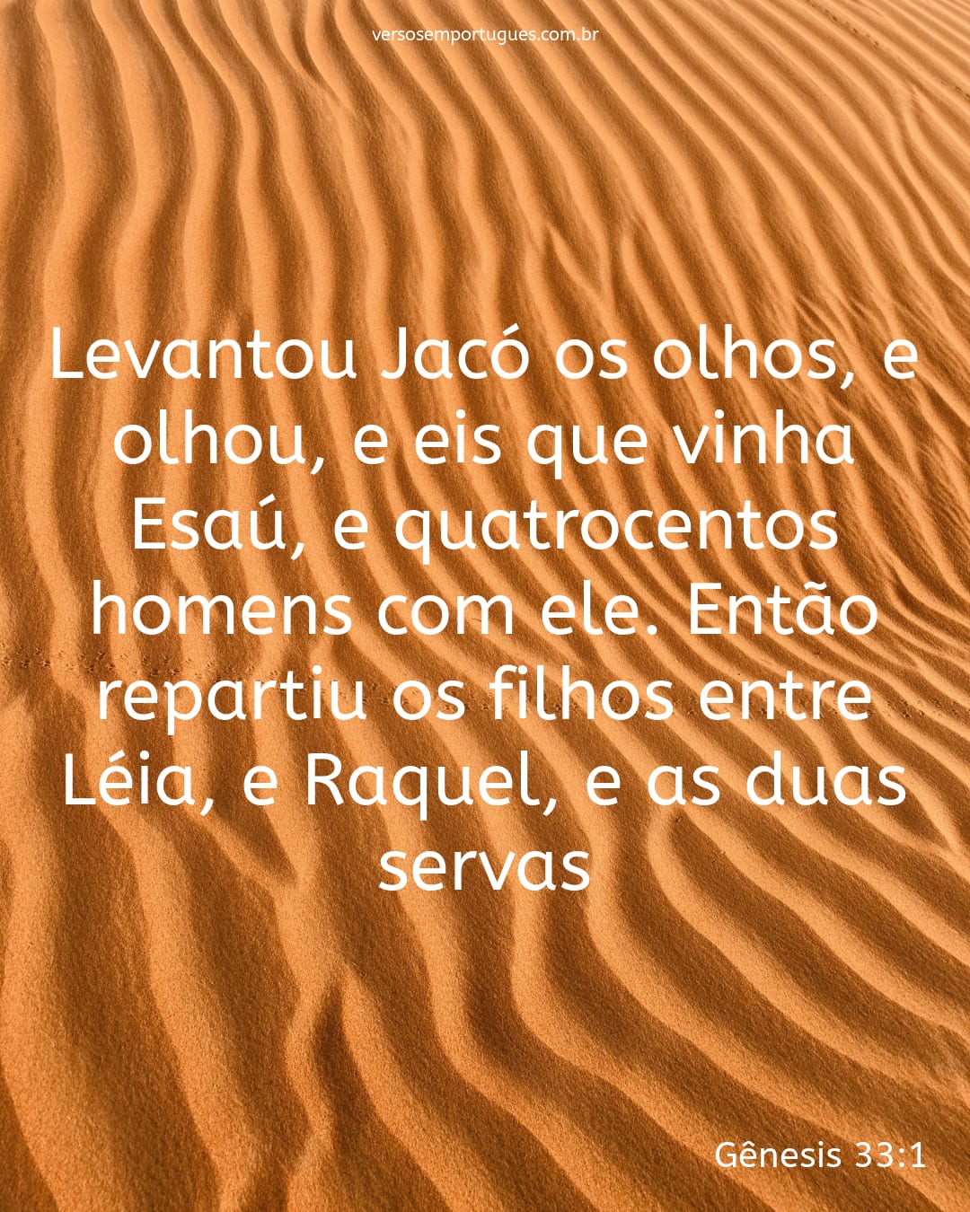 Levantou Jacó os olhos, e olhou, e eis que vinha Esaú, e quatrocentos homens com ele. Então repartiu os filhos entre Léia, e Raquel, e as duas servas.