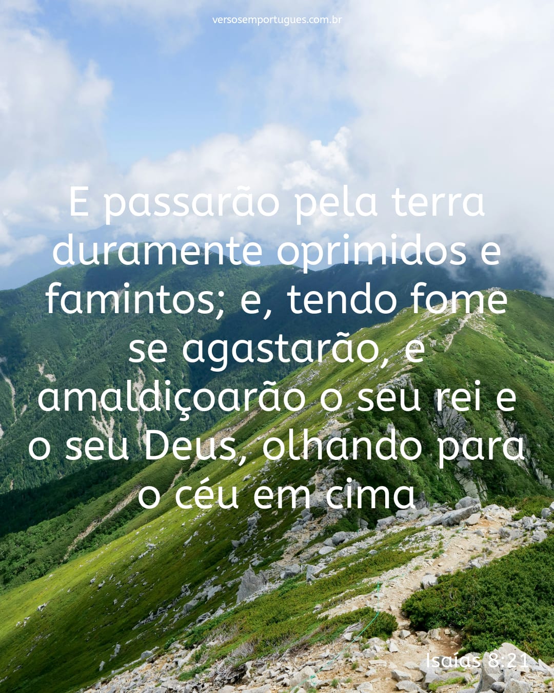 E passarão pela terra duramente oprimidos e famintos; e, tendo fome, se agastarão, e amaldiçoarão o seu rei e o seu Deus, olhando para o céu em cima;