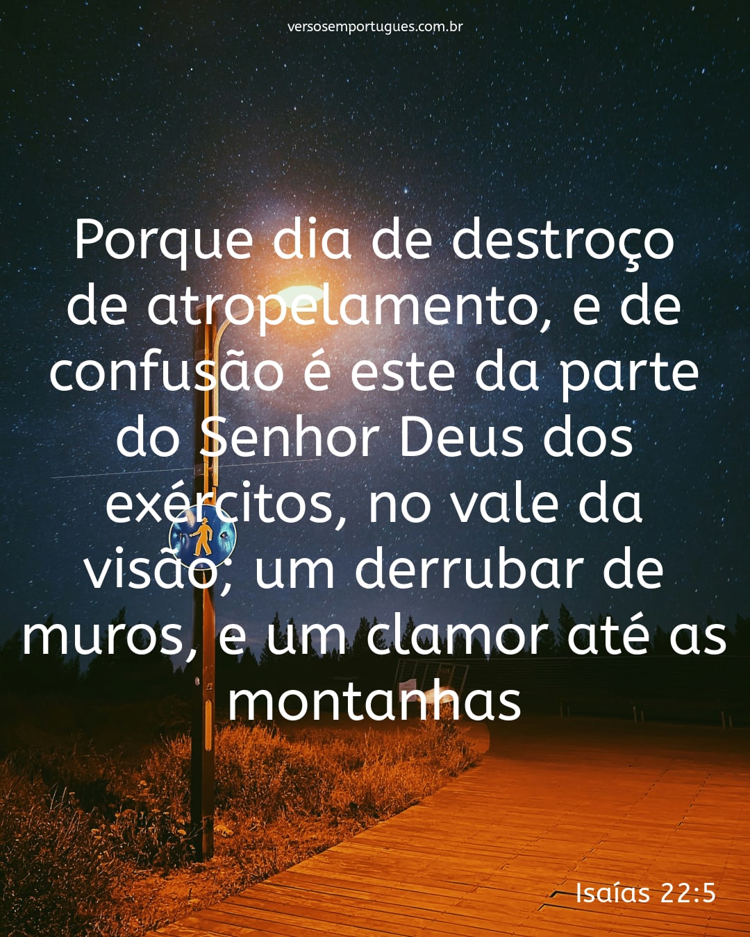 Porque dia de destroço, de atropelamento, e de confusão é este da parte do Senhor Deus dos exércitos, no vale da visão; um derrubar de muros, e um clamor até as montanhas.