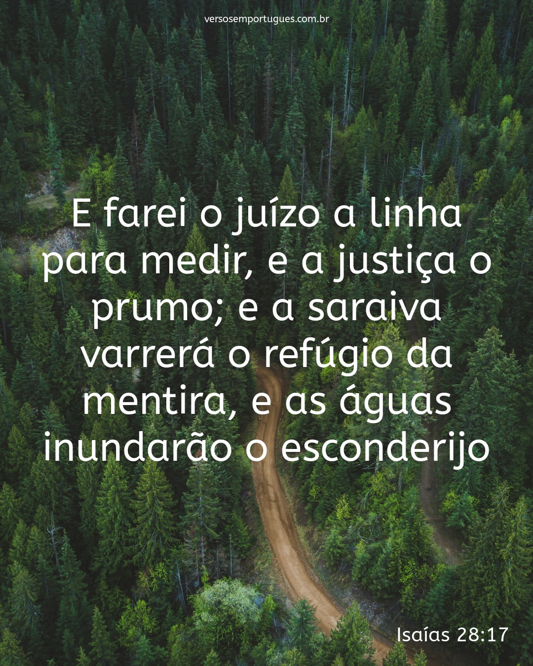 E farei o juízo a linha para medir, e a justiça o prumo; e a saraiva varrerá o refúgio da mentira, e as águas inundarão o esconderijo.