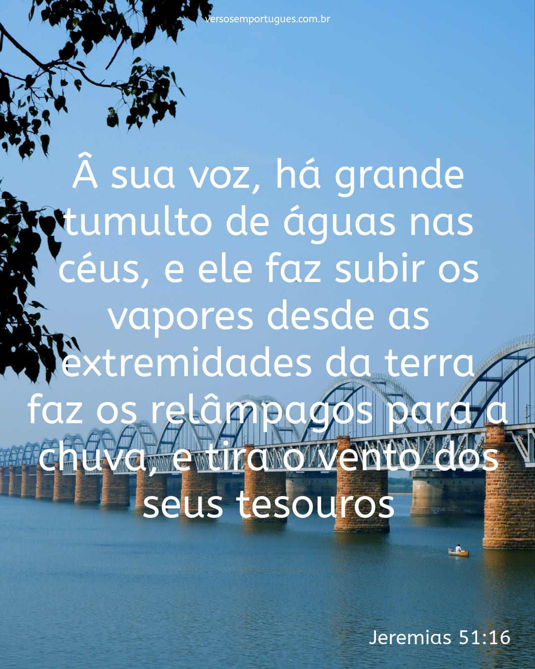 sua voz, há grande tumulto de águas nas céus, e ele faz subir os vapores desde as extremidades da terra; faz os relâmpagos para a chuva, e tira o vento dos seus tesouros.