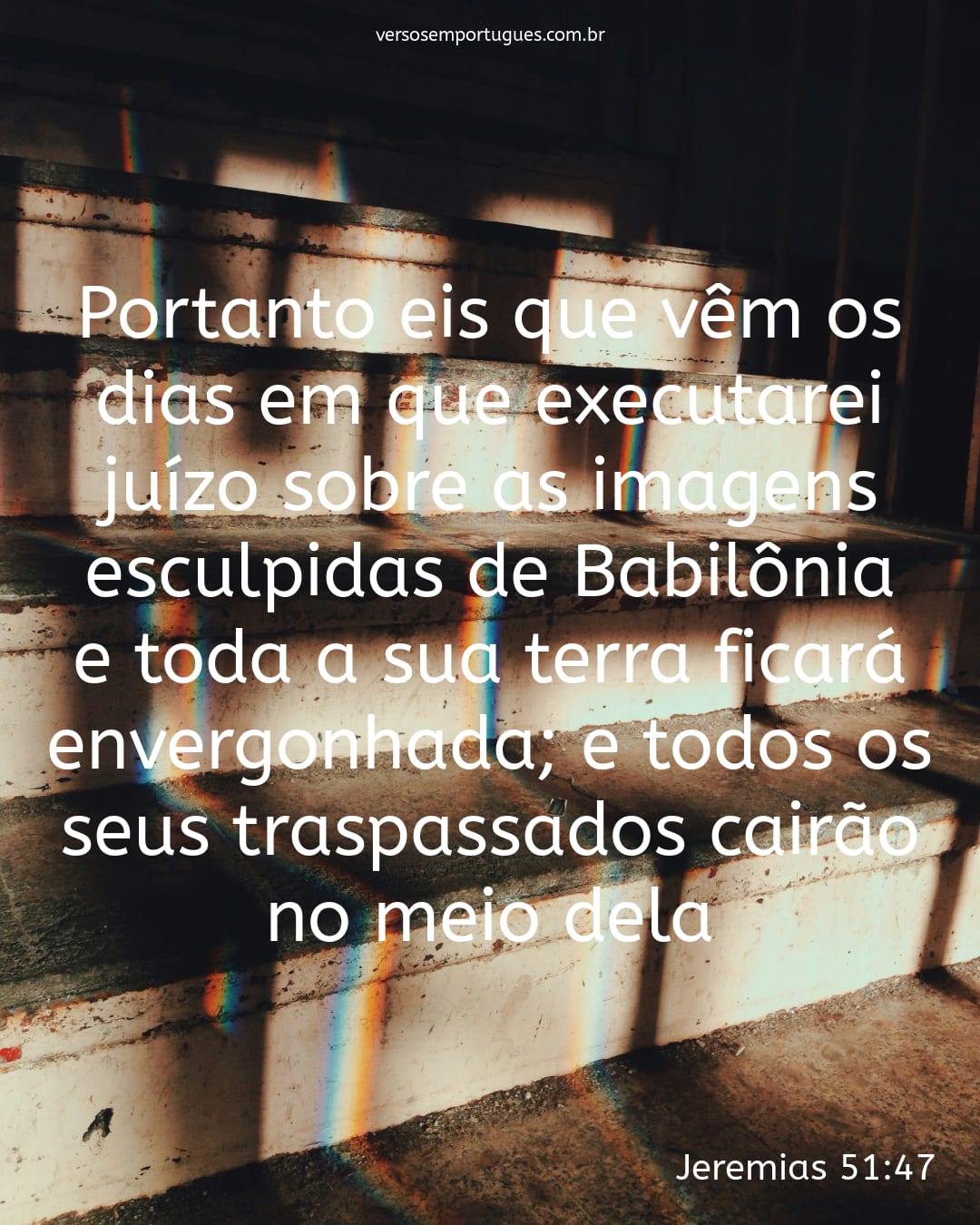 Portanto eis que vêm os dias em que executarei juízo sobre as imagens esculpidas de Babilônia; e toda a sua terra ficará envergonhada; e todos os seus traspassados cairão no meio dela.