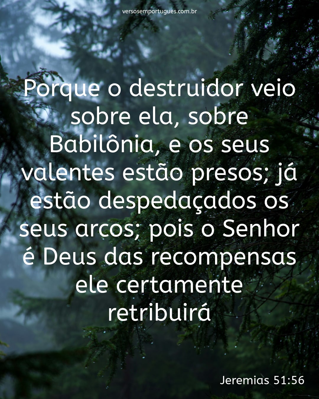 Porque o destruidor veio sobre ela, sobre Babilônia, e os seus valentes estão presos; já estão despedaçados os seus arcos; pois o Senhor é Deus das recompensas, ele certamente retribuirá.