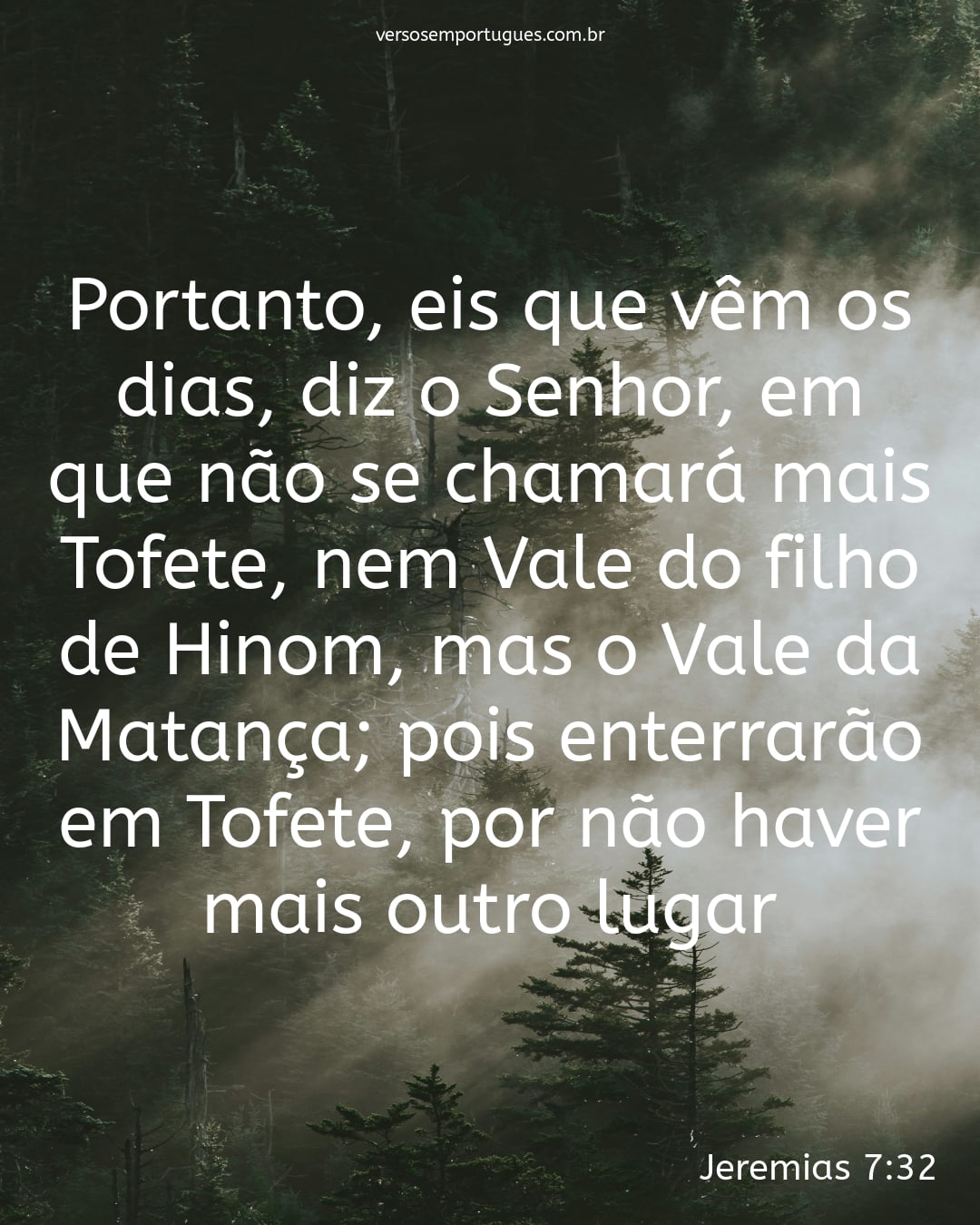 Portanto, eis que vêm os dias, diz o Senhor, em que não se chamará mais Tofete, nem Vale do filho de Hinom, mas o Vale da Matança; pois enterrarão em Tofete, por não haver mais outro lugar.