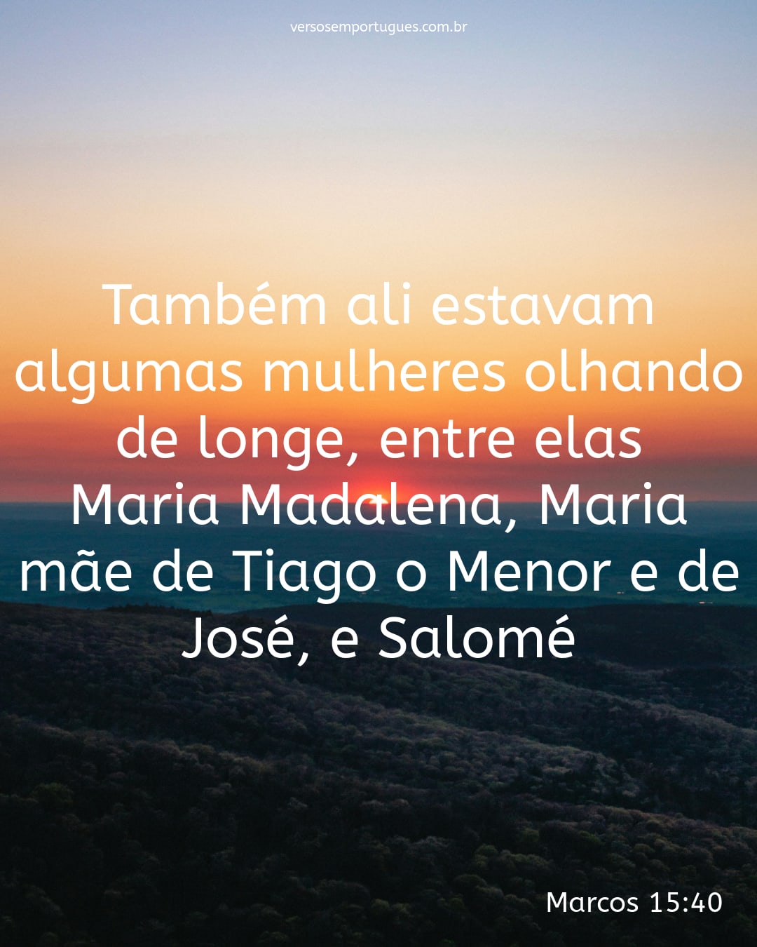 Também ali estavam algumas mulheres olhando de longe, entre elas Maria Madalena, Maria, mãe de Tiago o Menor e de José, e Salomé;
