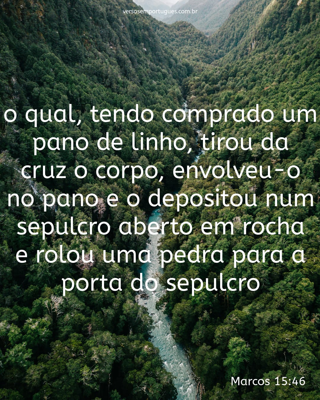 o qual, tendo comprado um pano de linho, tirou da cruz o corpo, envolveu-o no pano e o depositou num sepulcro aberto em rocha; e rolou uma pedra para a porta do sepulcro.