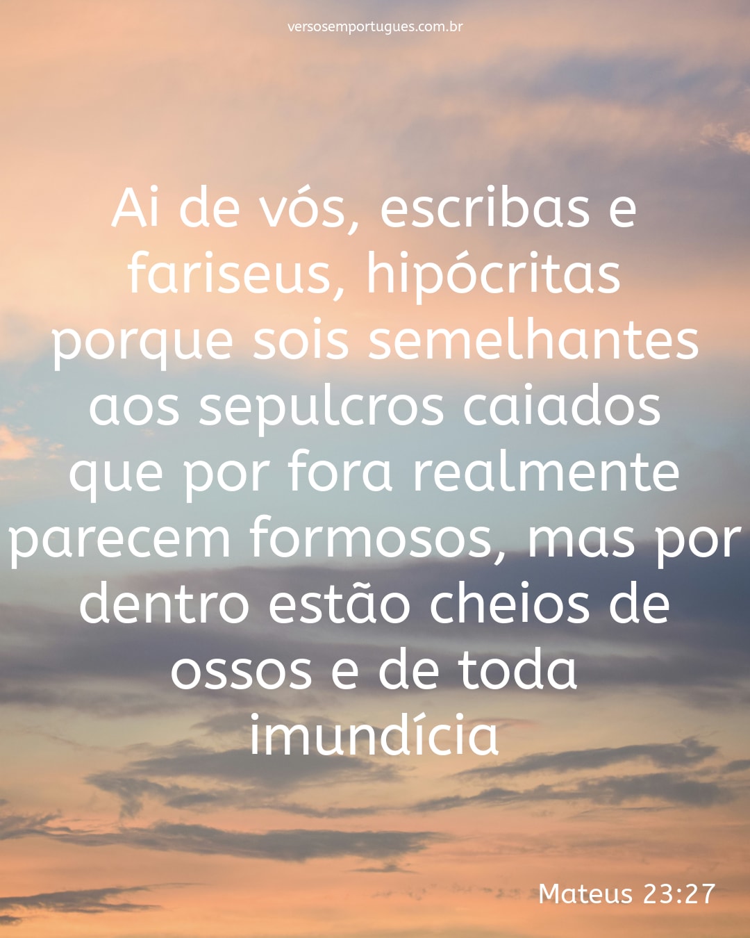 Ai de vós, escribas e fariseus, hipócritas! porque sois semelhantes aos sepulcros caiados, que por fora realmente parecem formosos, mas por dentro estão cheios de ossos e de toda imundícia.