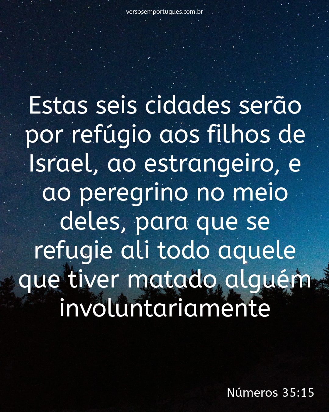 Estas seis cidades serão por refúgio aos filhos de Israel, ao estrangeiro, e ao peregrino no meio deles, para que se refugie ali todo aquele que tiver matado alguém involuntariamente.