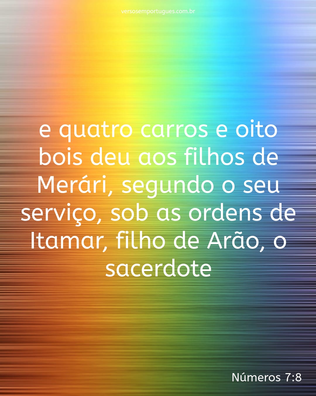 e quatro carros e oito bois deu aos filhos de Merári, segundo o seu serviço, sob as ordens de Itamar, filho de Arão, o sacerdote.