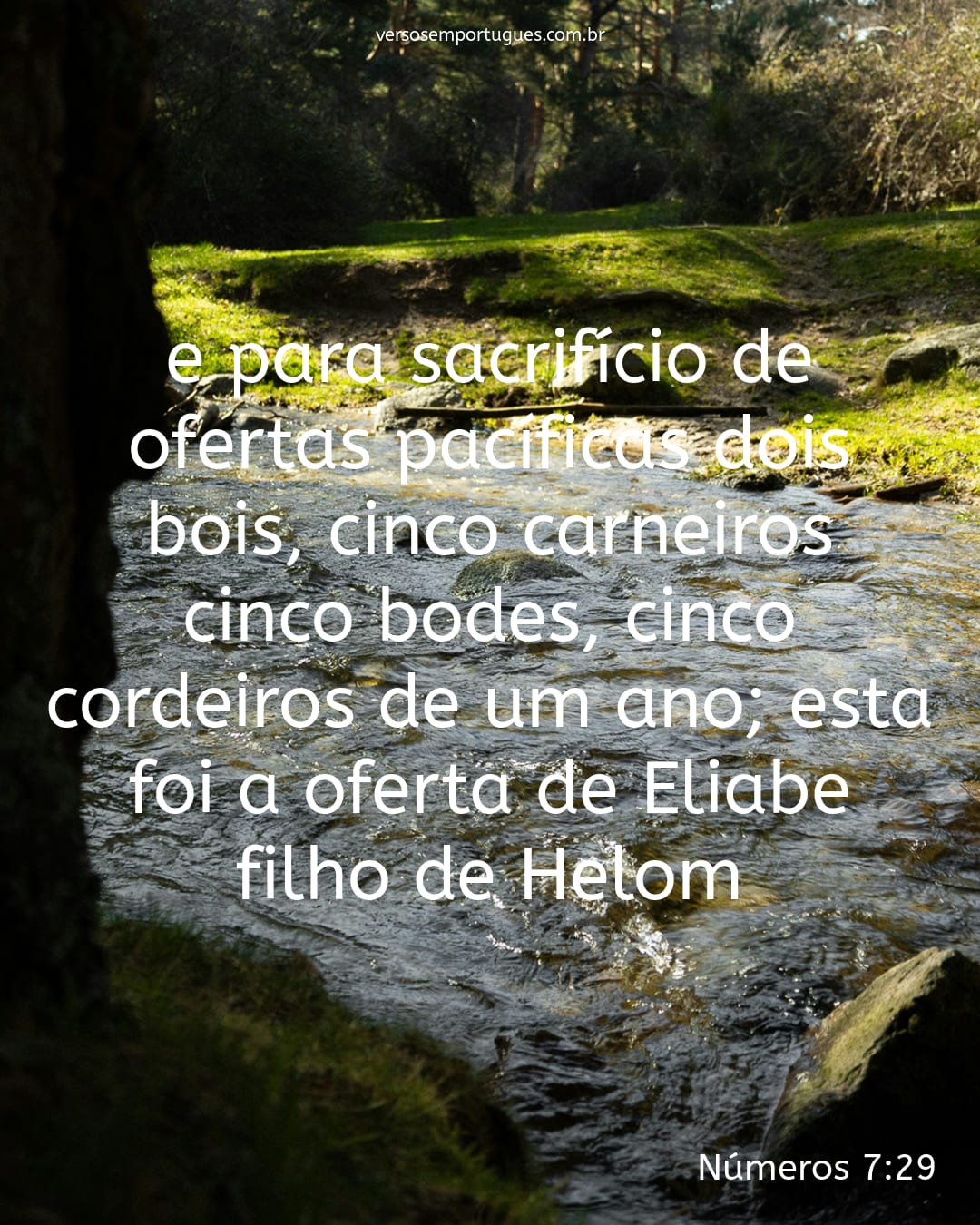 e para sacrifício de ofertas pacíficas dois bois, cinco carneiros, cinco bodes, cinco cordeiros de um ano; esta foi a oferta de Eliabe, filho de Helom.
