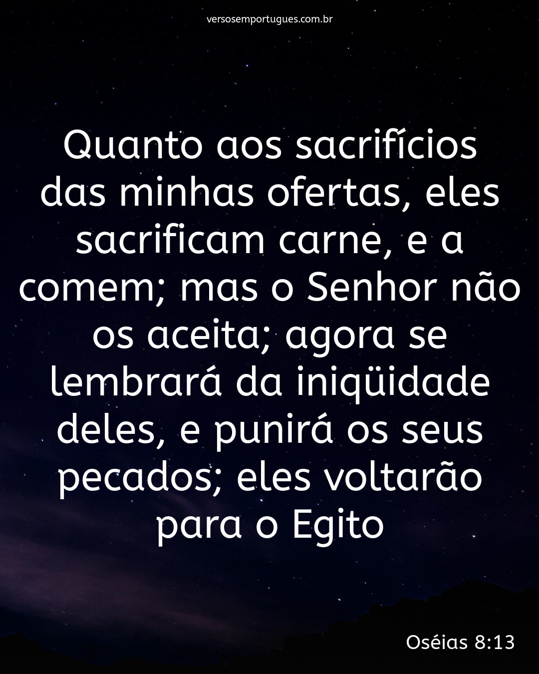 Quanto aos sacrifícios das minhas ofertas, eles sacrificam carne, e a comem; mas o Senhor não os aceita; agora se lembrará da iniqüidade deles, e punirá os seus pecados; eles voltarão para o Egito.